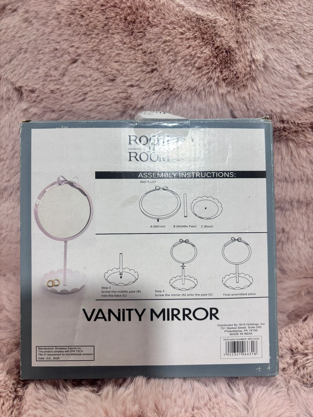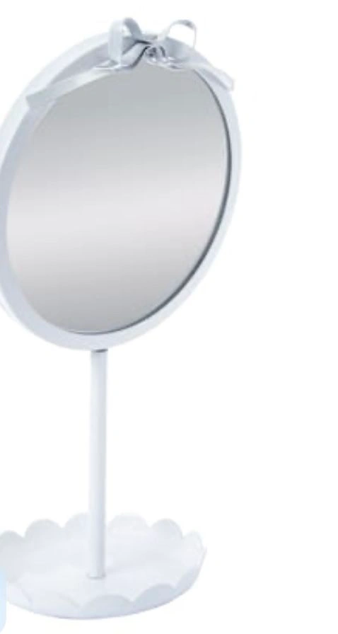 Charming Room to Room vanity mirror featuring a round tabletop design with a decorative bow detail and scalloped base. A lovely accent piece for a bedroom, dorm, vanity, or desk. New, unused. Still in original box. Box shows light shelf/storage wear. All parts included (assembly required). Approx. Dimensions: 6.5” W x 5” D x 12.25” H. Freestanding tabletop vanity mirror. Lightweight and easy to assemble. Neutral white finish complements many décor styles. Perfect for makeup, skincare, or decorative use.