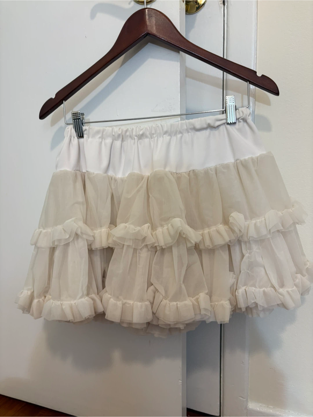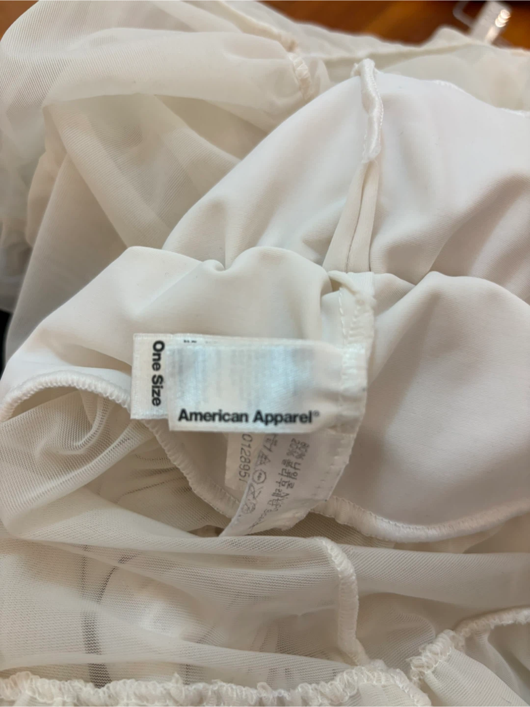 This is a playful tulle skirt from American Apparel. It features multiple layers of ruffles and an elastic waistband for a comfortable fit. The skirt is a versatile one size and made of sheer fabric.