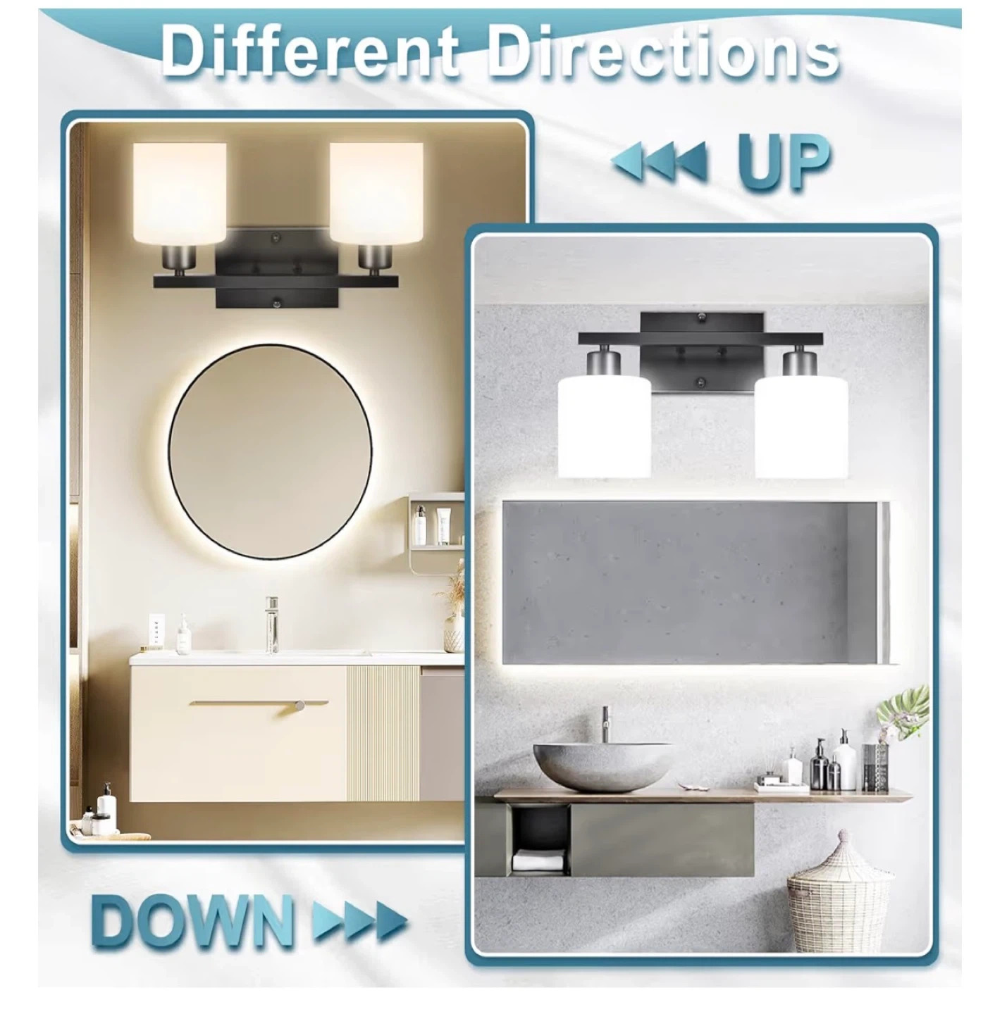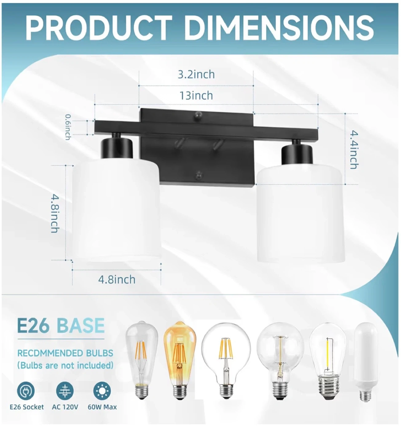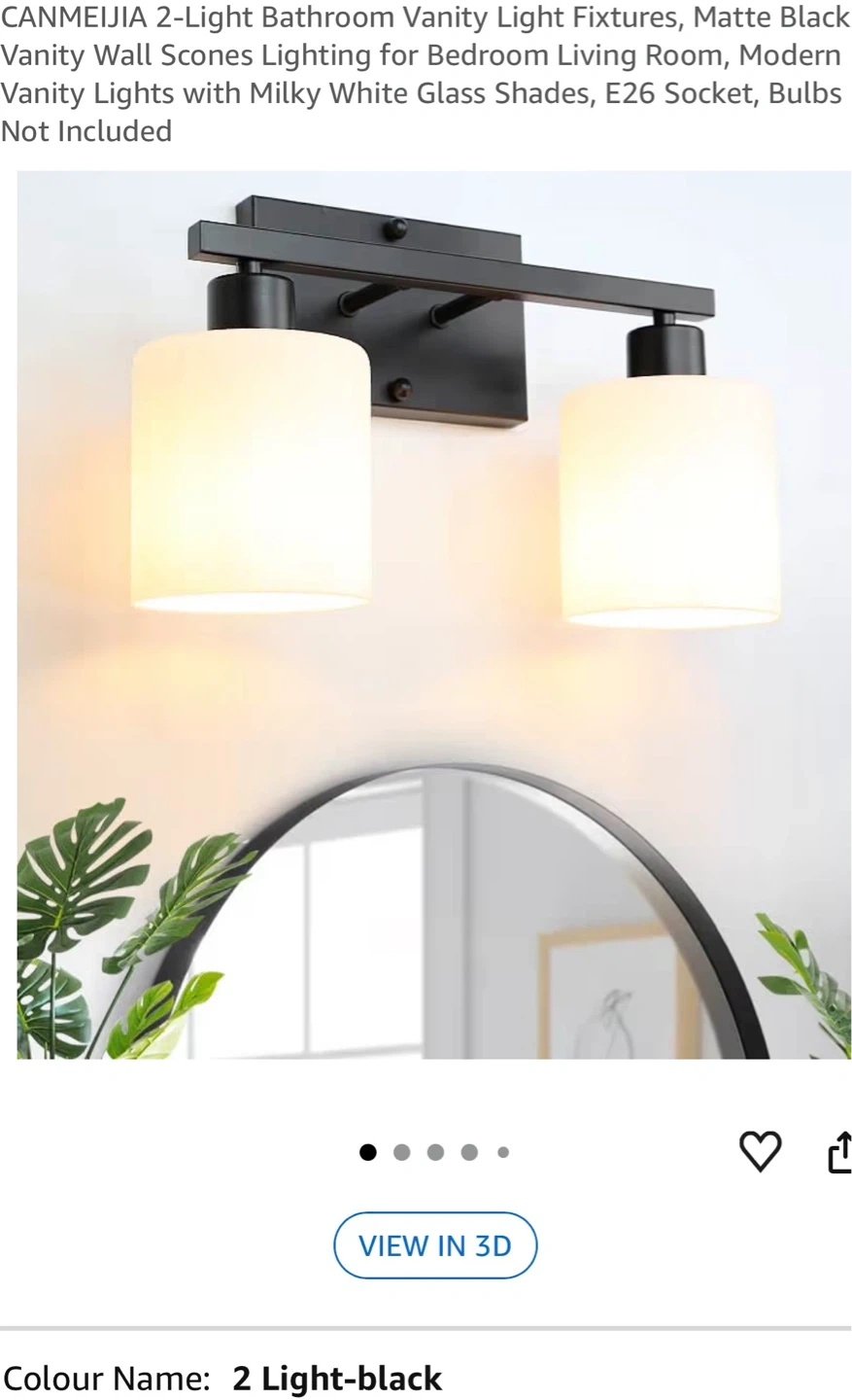This is a 2-light vanity light fixture with a matte black finish. It features white glass shades and E26 sockets. The fixture has an anti-rust and corrosion-resistant design. Mounting plate is universal.