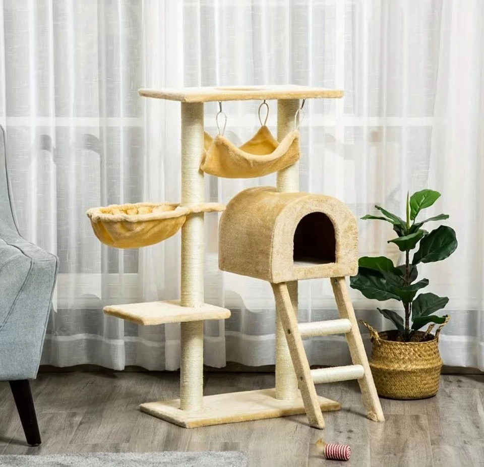 Brand new PawHut cat tree condo. Features multiple levels for your cat to explore, including scratching posts, a hammock, a basket, a hideaway house, and a ladder. Beige color. Stands 38.5 inches tall with a base of 21.25 inches by 11.5 inches. Your furry friend will love this!