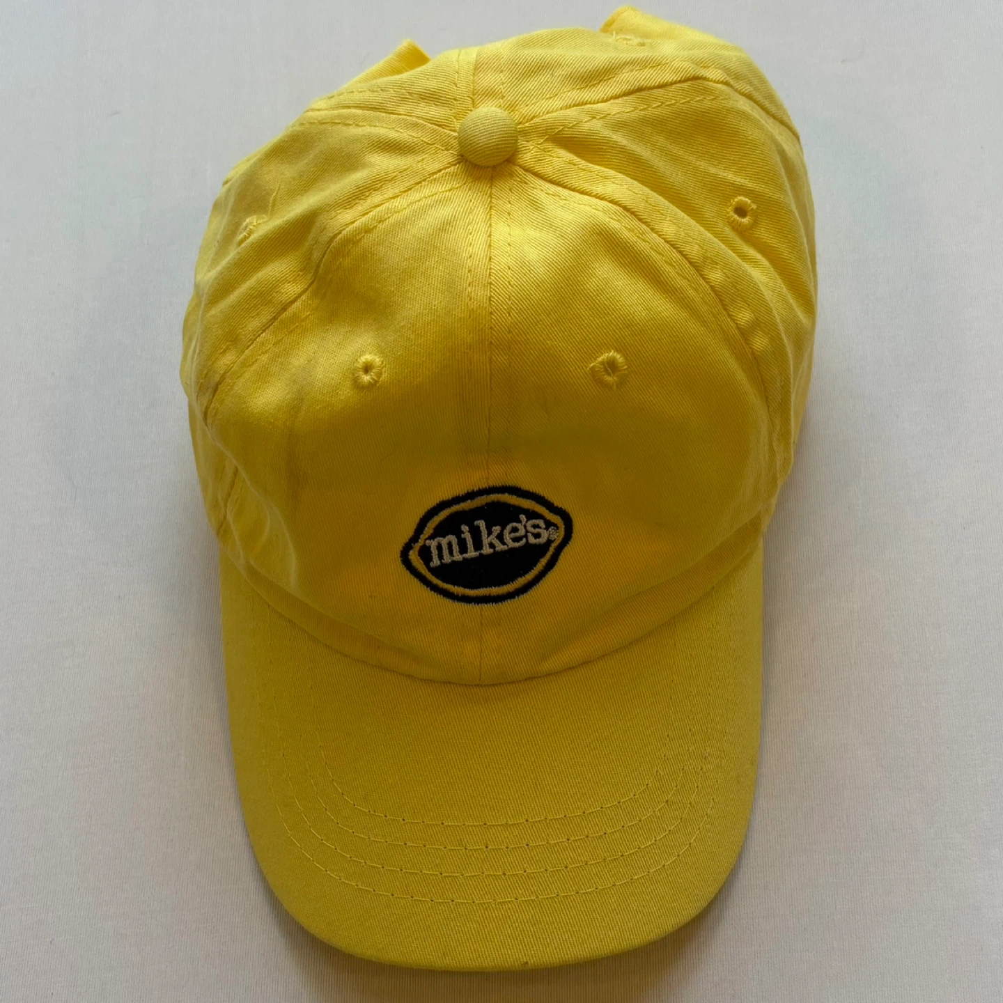 Keywords: Mike's Hard Lemonade, Mike's Hat, Yellow Baseball Cap, Dad Hat, Adjustable, Promotional Merch, Promo Hat, Beverage Brand, Summer Hat, Festival Gear, Embroidered Logo, Unisex, Streetwear, Casual, Bright Yellow, Buckle Closure, Collectible
