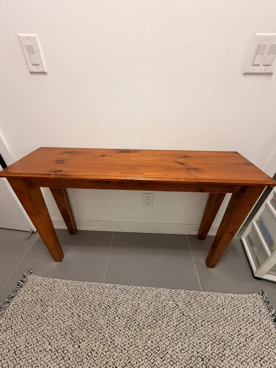 This is a wood console table with a warm, honey-toned finish. It's made of pine and features a simple, sturdy design. It's a great size for hallways or behind a sofa.
