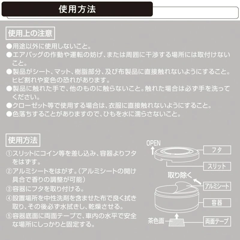 The low-center-of-gravity round design allows for easy installation. The cushioned double-sided tape securely attaches to the dashboard. The 68mm diameter fits any car drink holder. The double-sided tape includes a cushion for secure attachment to the dashboard, preventing residue when removed. *Dashboards with soft surfaces that dent slightly when pressed with your finger may be damaged when removing the adhesive tape. ●Contents: 60g x 3 bottles ●Lasts approximately 30 days per bottle. *Lasts may vary depending on usage environment. ●Rich Premium White Musk Scent: This premium white musk scent, based on the popular white musk scent, blends clean white rose and sandalwood for a pleasantly sweet experience. Contains natural fragrances extracted from high-quality ingredients. [TOP NOTE] Green apple, raspberry [MIDDLE NOTE] Lily of the valley, white rose, jasmine, rose [LAST NOTE] Musk, sandalwood, amber. * Dashboards with soft surfaces that dent slightly when pressed with your finger may be damaged when removing the adhesive tape due to aging. Please apply the tape to a location other than the dashboard. *Please be especially careful with imported vehicles. Do not install in locations that may interfere with airbag deployment or driving, or on the dashboard or footwell on the driver's side (there is a danger of getting caught in the pedals in the event of a rollover). Do not install multiple units in vehicles with large interiors such as minivans.