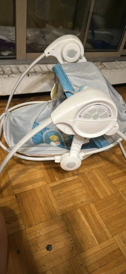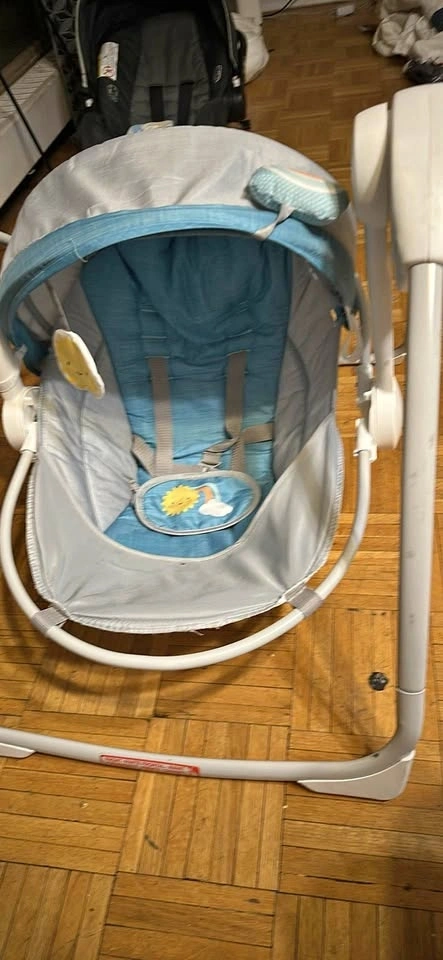 Gentle baby swing with soothing motions. It's made with comfortable fabric and includes overhead toys for entertainment. Suitable for little ones needing a calm space. Could give you a discount if you get more than one item! Cash on pick up only please.