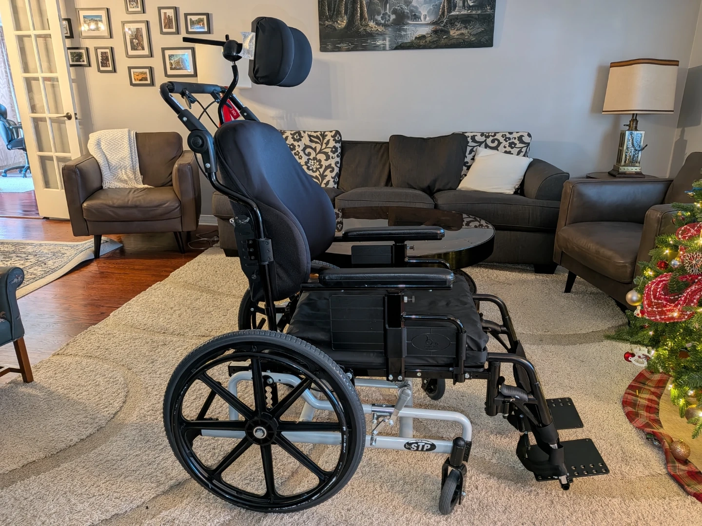 Excellent condition, purchased new and lightly used for approximately six months in a home setting. This is a high-quality Power Plus Mobility STP (Super Tilt Plus) tilt-in-space wheelchair designed for long-term comfort, posture support, pressure relief, and caregiver-assisted mobility.