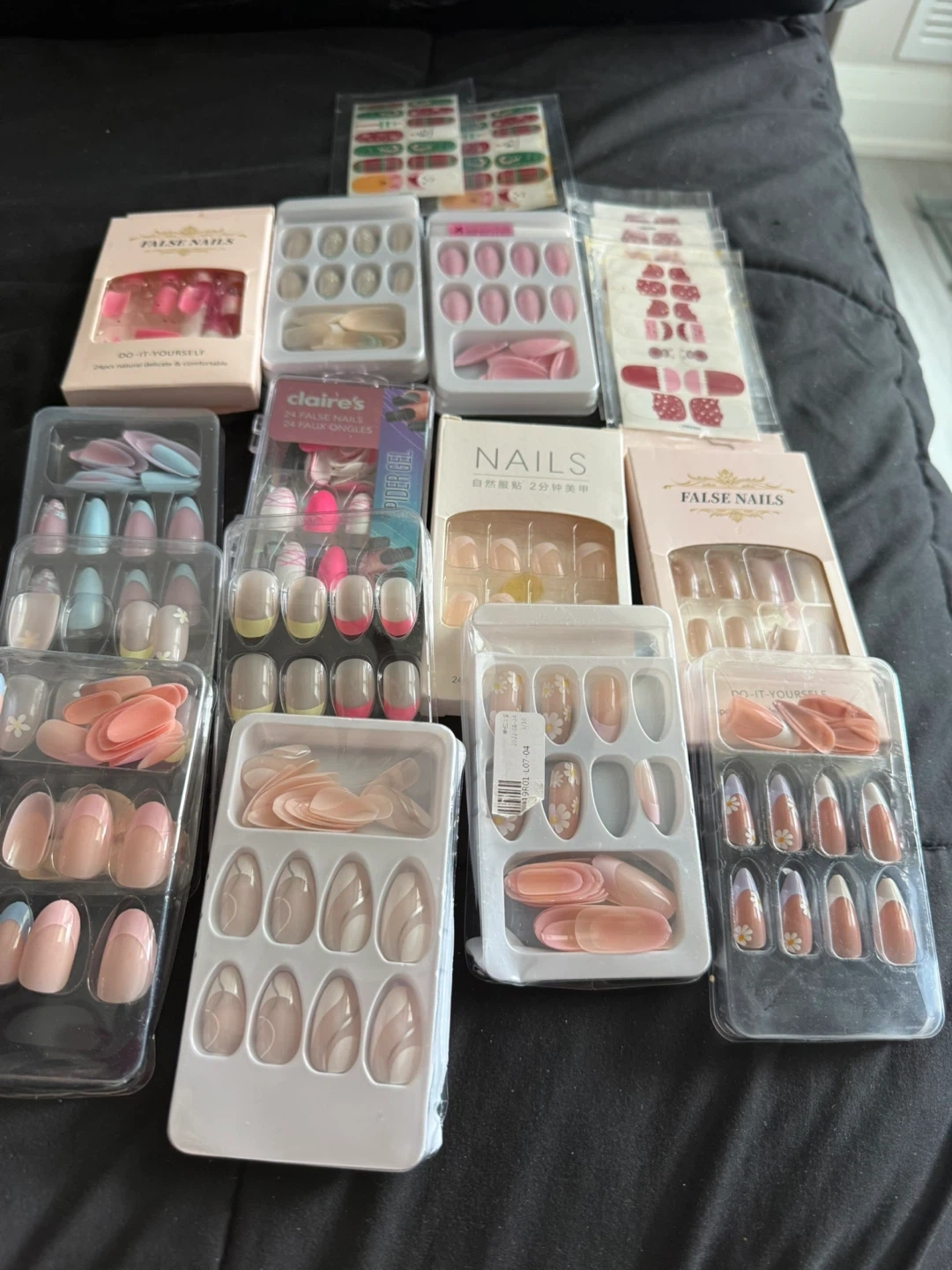 A collection of assorted false nail sets with various designs and colours. Includes French tip, natural finishes, and decorative patterns. Each set contains multiple sizes for a custom fit. Great for quick nail makeovers at home! Sell all for $50