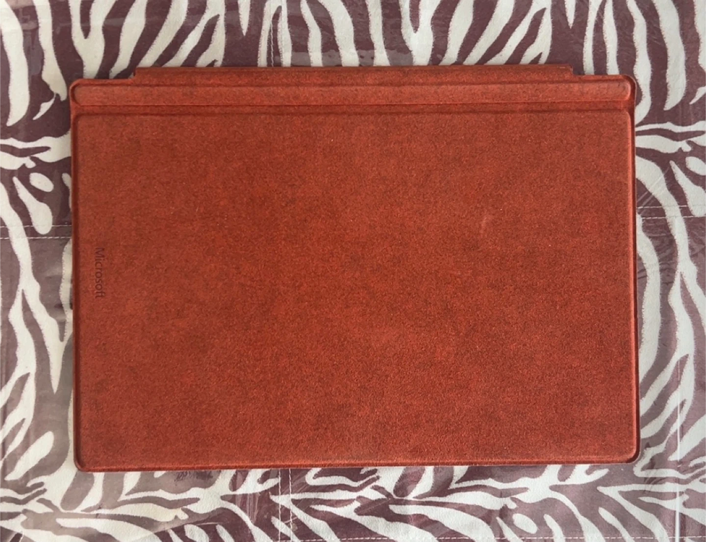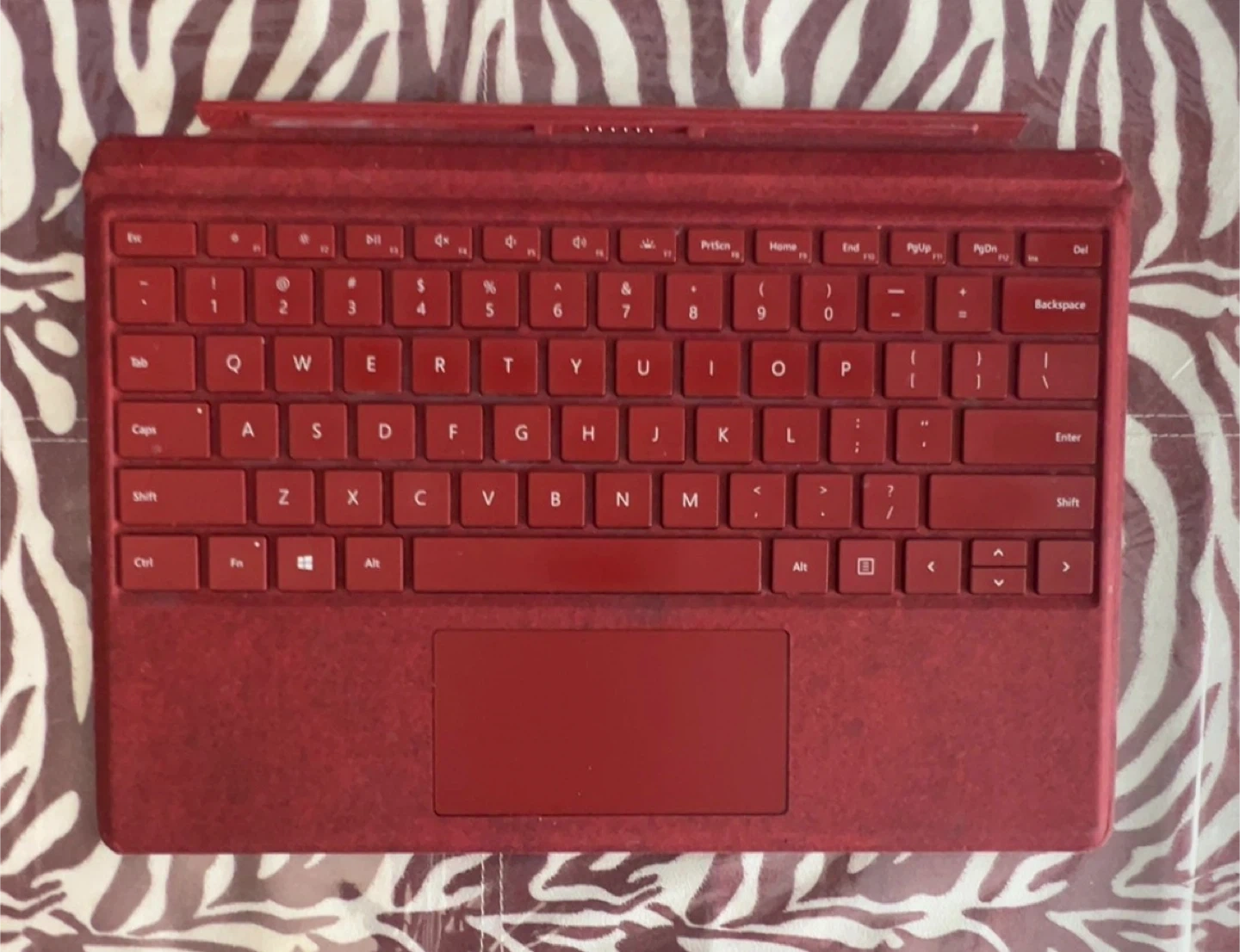 This is a Microsoft Surface Pro Type Cover in a nice burgundy colour. It's a keyboard and cover for your Surface Pro device. It attaches magnetically and provides a full keyboard and trackpad experience. It's in good condition.