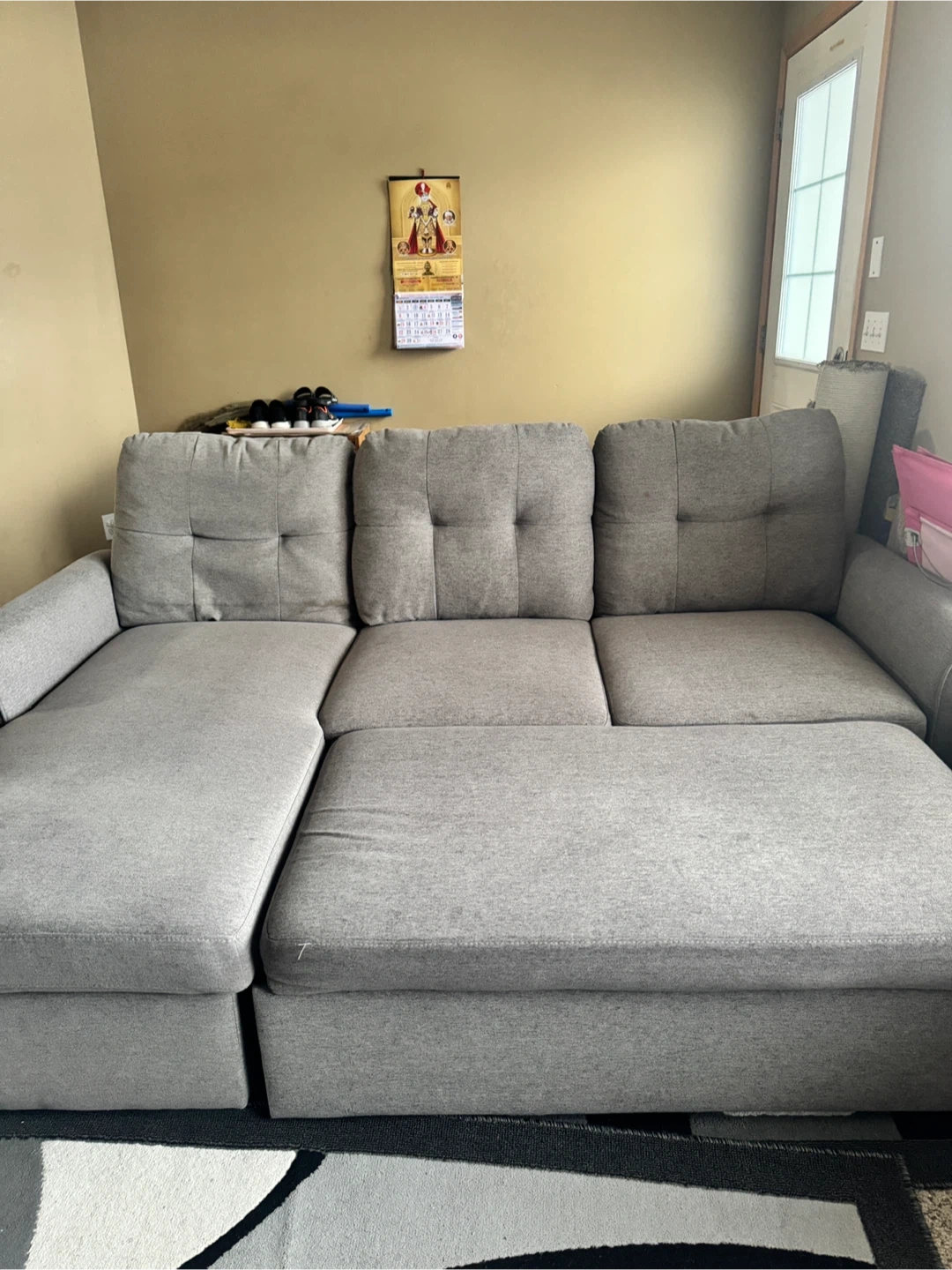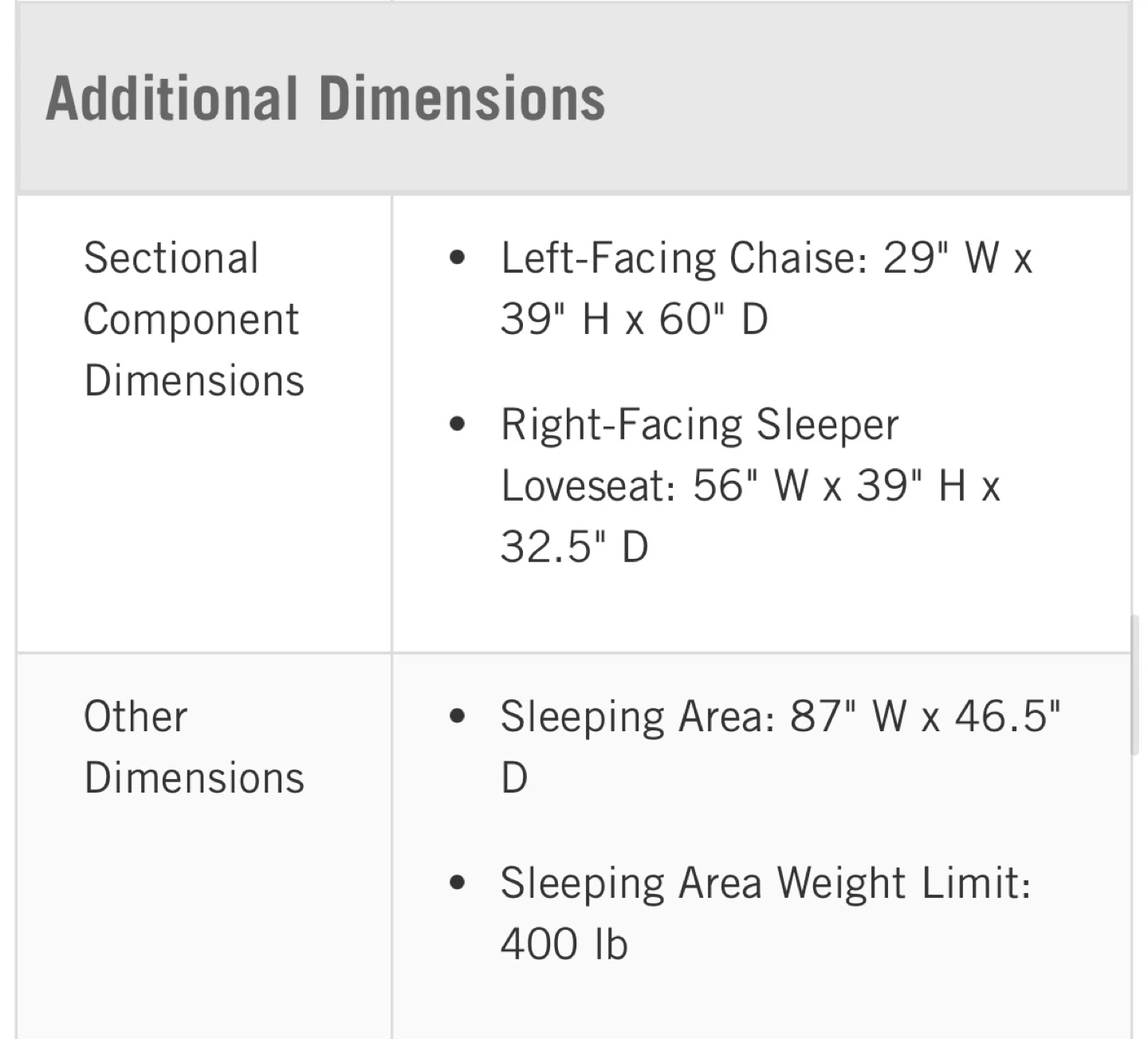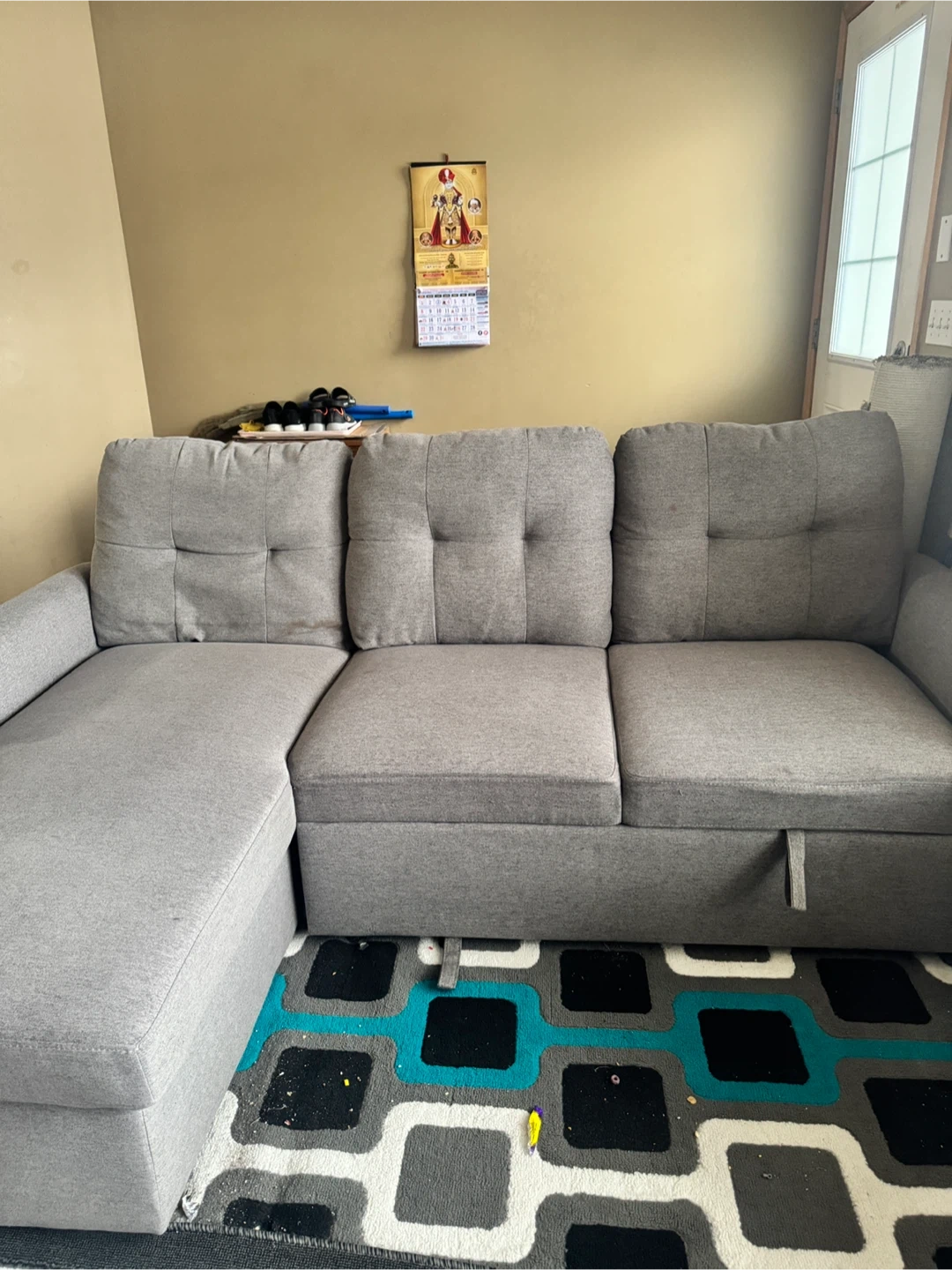 A grey sectional sofa featuring a pull-out sleeper function. New buy is $1500 and no stain always use with care. The left-facing chaise measures 29" W x 39" H x 60" D, and the right-facing sleeper loveseat measures 56" W x 39" H x 32.5" D. The sleeping area is 87" W x 46.5" D and supports up to 400 lb. It is foldable and easy to move. Only pick up.