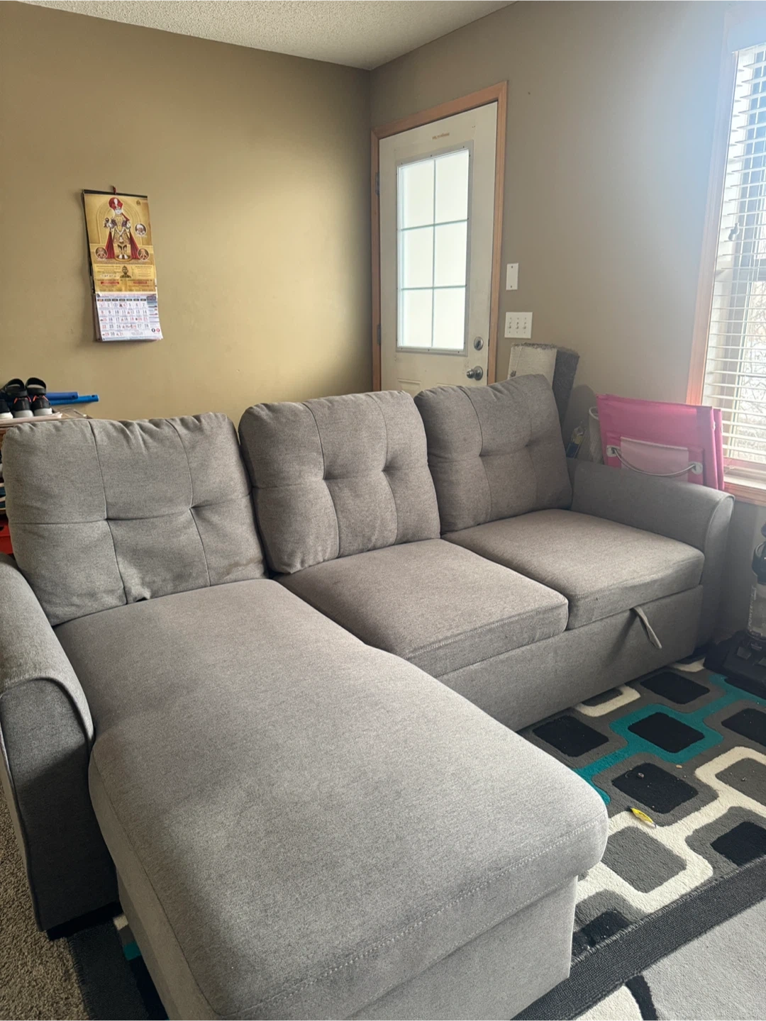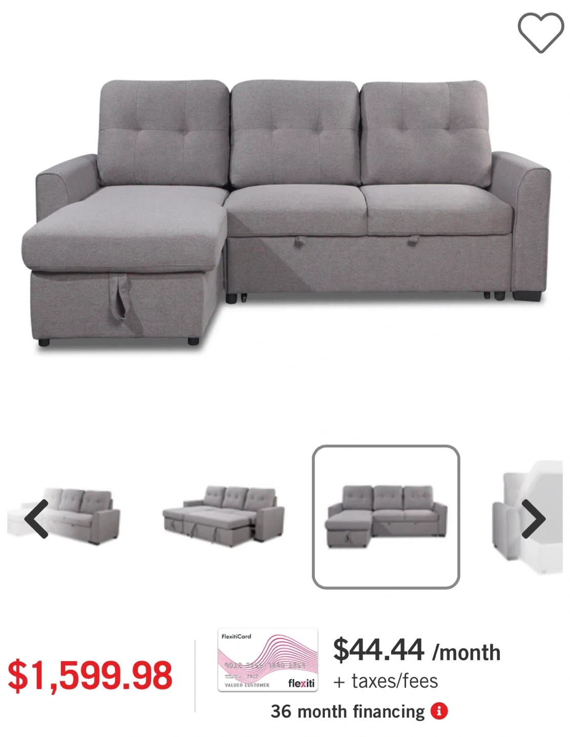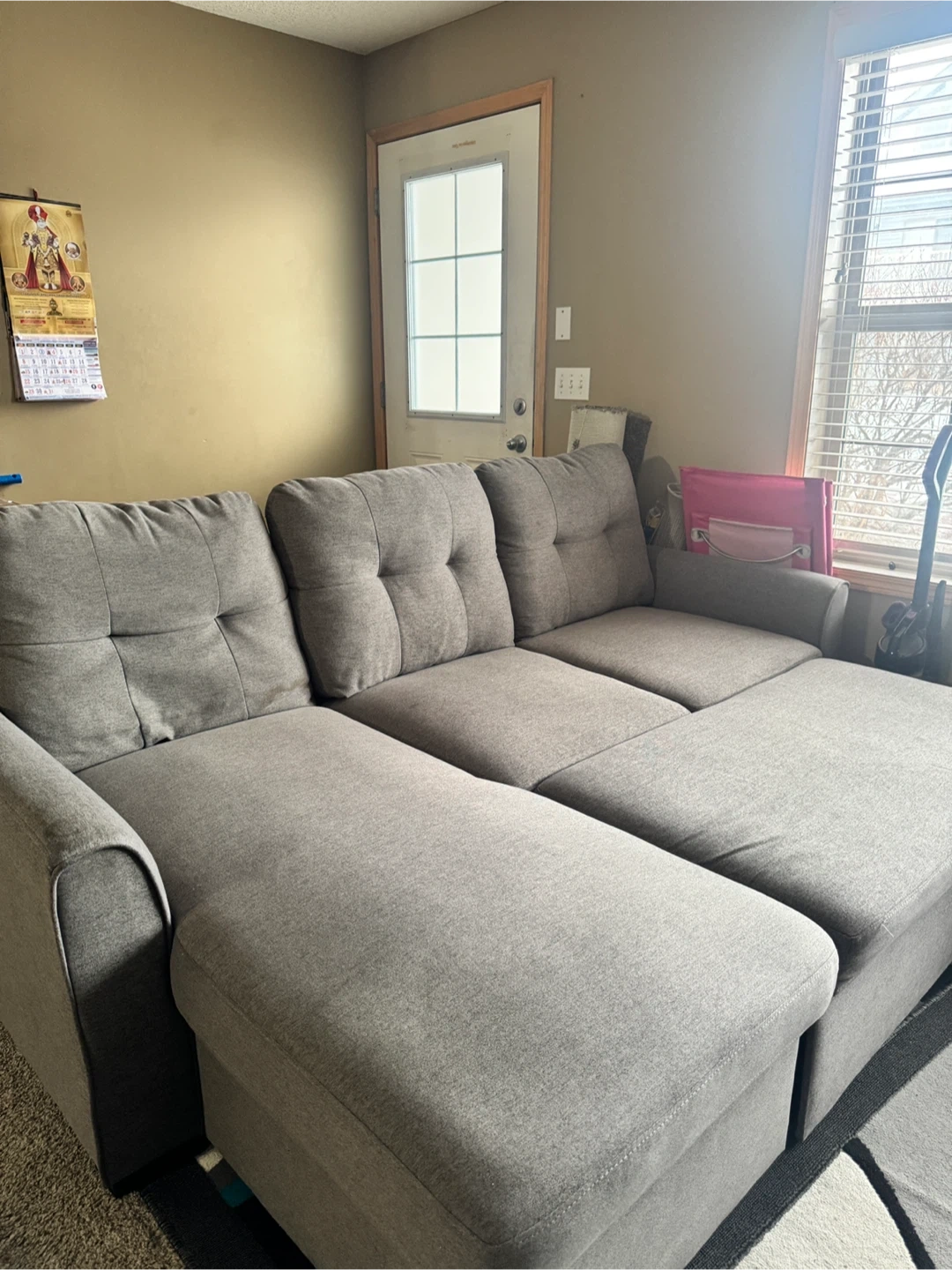 A grey sectional sofa featuring a pull-out sleeper function. New buy is $1500 and no stain always use with care. The left-facing chaise measures 29" W x 39" H x 60" D, and the right-facing sleeper loveseat measures 56" W x 39" H x 32.5" D. The sleeping area is 87" W x 46.5" D and supports up to 400 lb. It is foldable and easy to move. Only pick up.