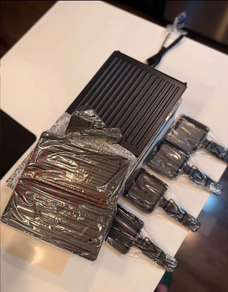 Raclette grill with a stone grill top and a non-stick griddle plate. Comes with 8 individual raclette pans, still in plastic wrap. Adjustable temperature control for easy cooking. Perfect for entertaining!