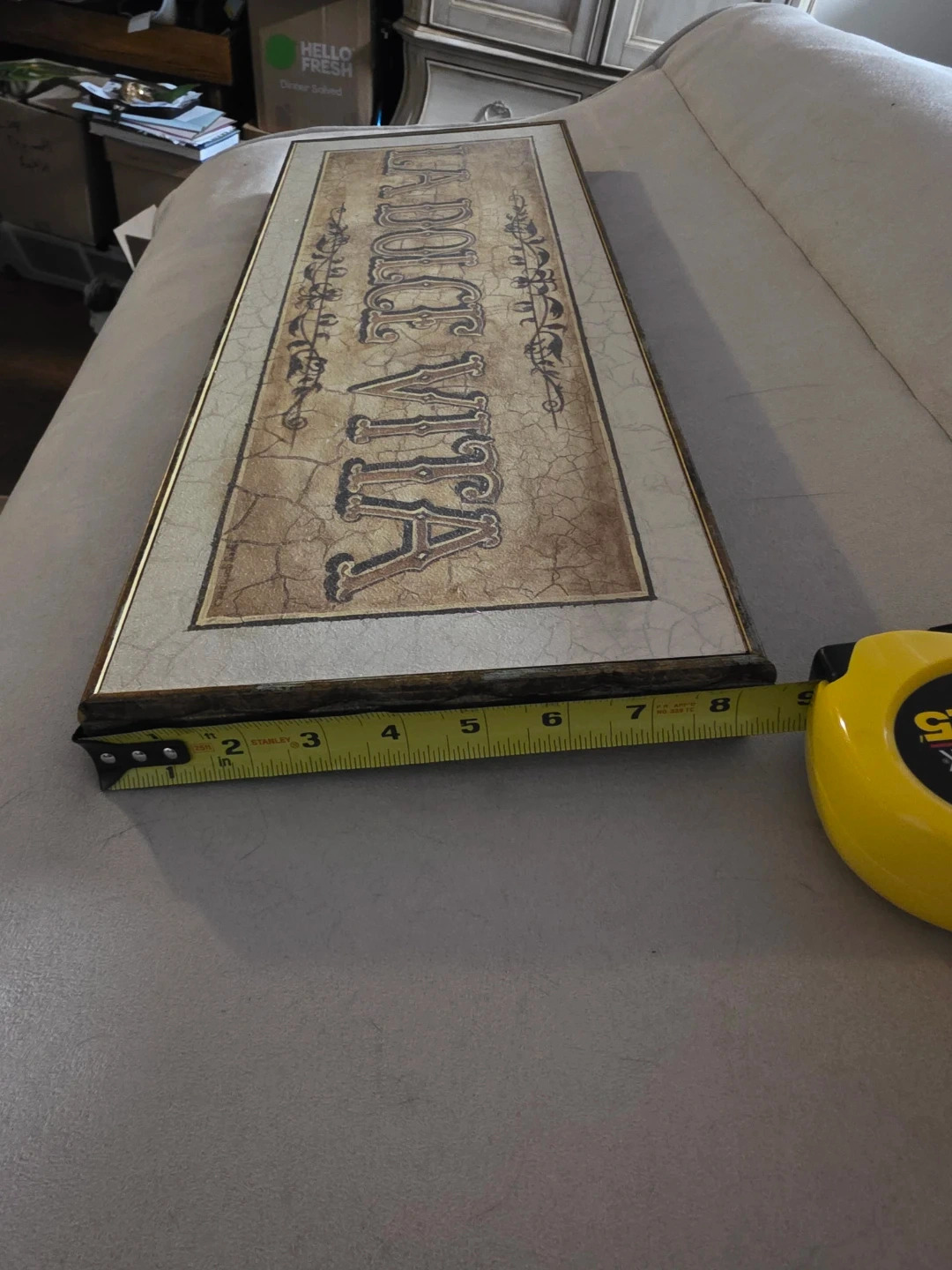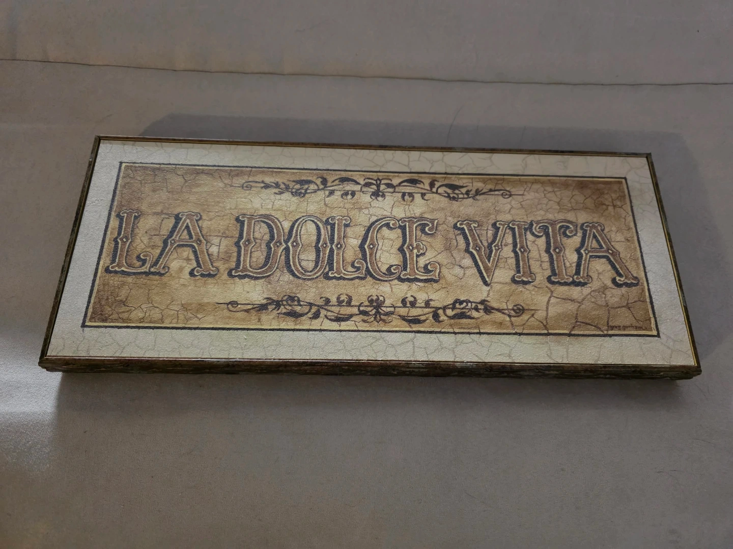 Decorative framed wall art featuring "La Dolce Vita" text. Measures approximately 21 inches long. Adds a touch of European charm to your decor.