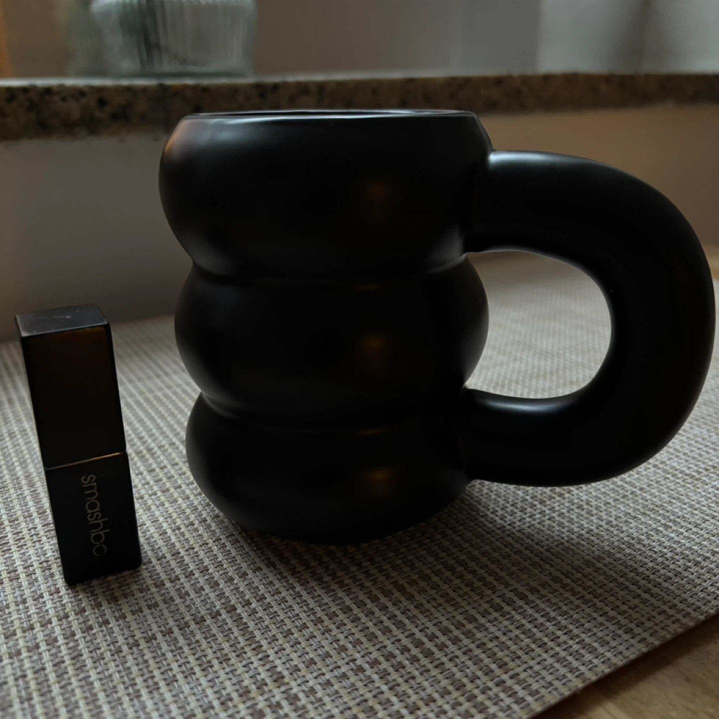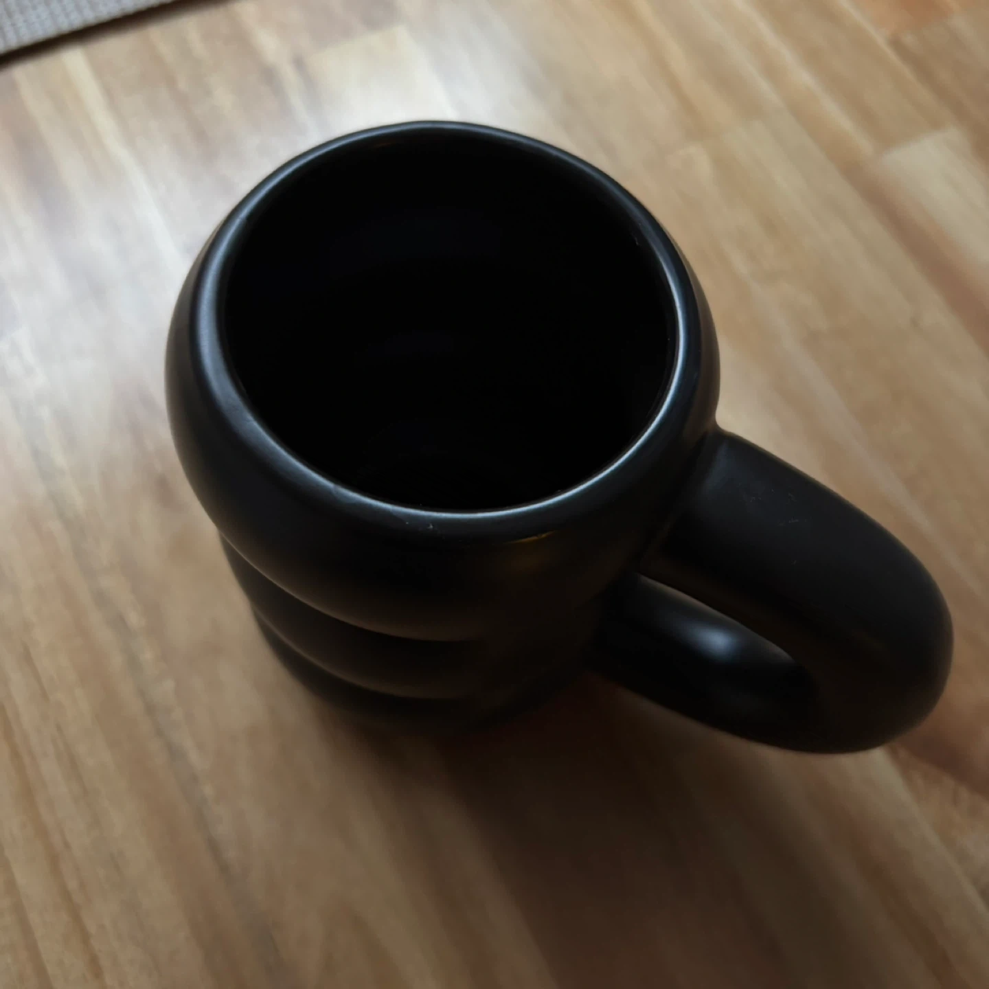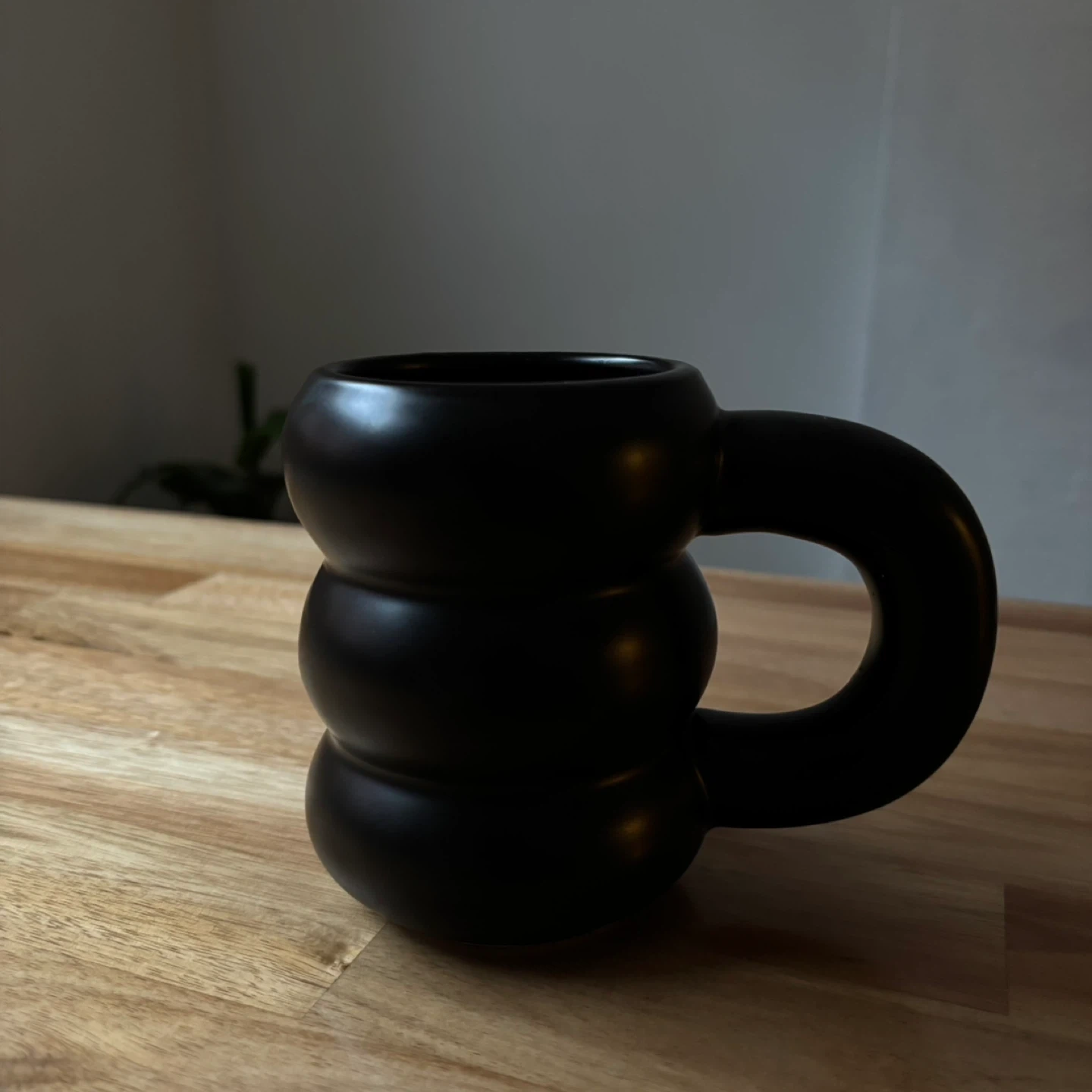 This unique black mug has a playful, puffed design. It's made of ceramic and has a sturdy handle for a comfortable grip. Great for your morning coffee or tea!