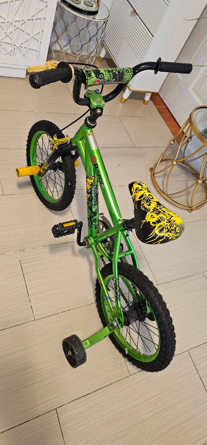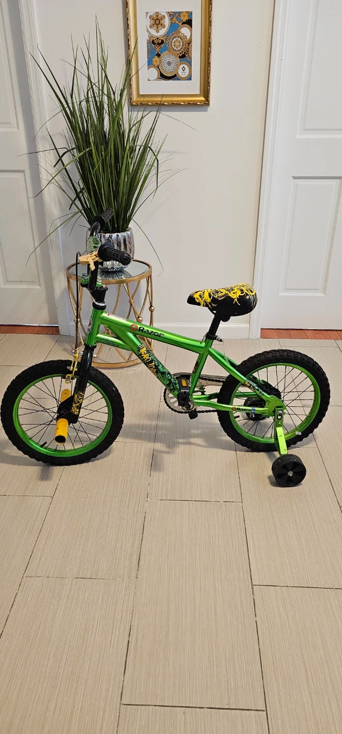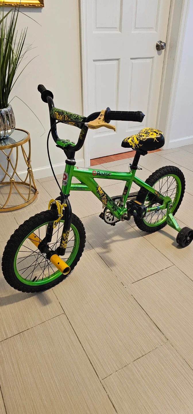 This is a Razor kids' BMX bike in green. It features training wheels for stability and a yellow and black patterned seat. The bike has 16-inch wheels and hand brakes.
