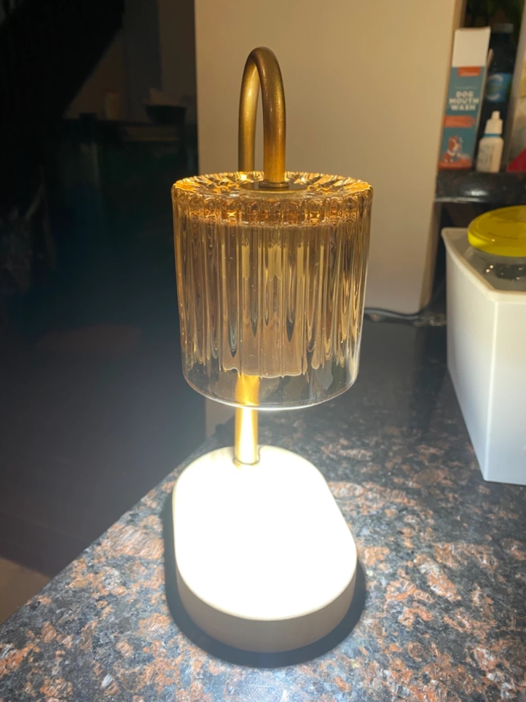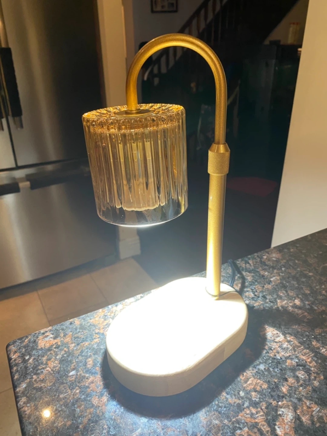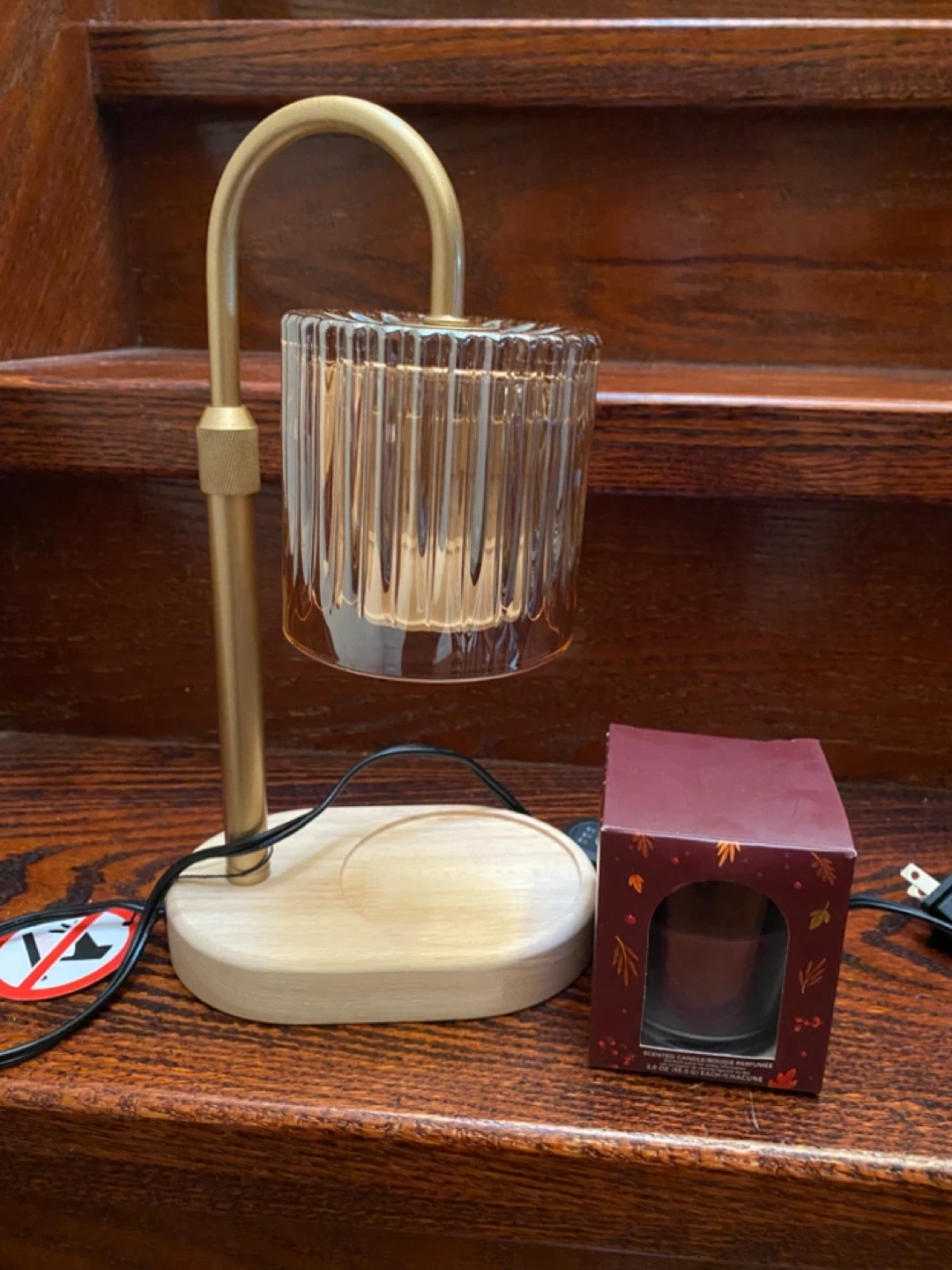 This is a scented candle warmer lamp with a glass shade. It comes with one new 3.0 oz (85.5 g) scented candle.