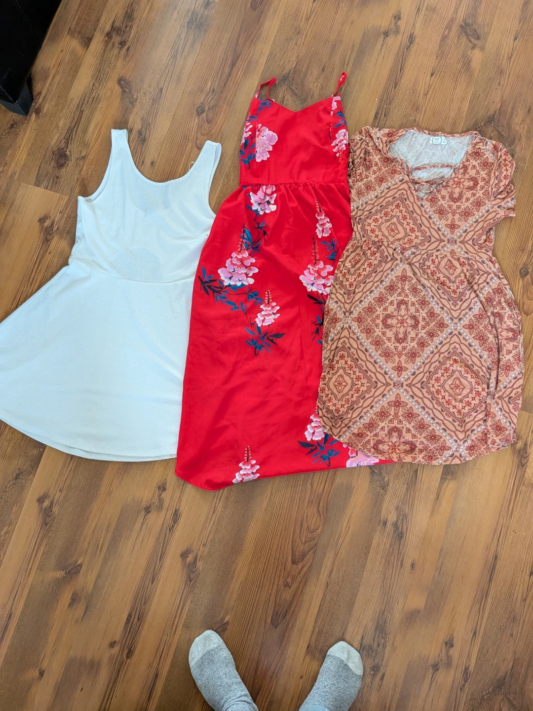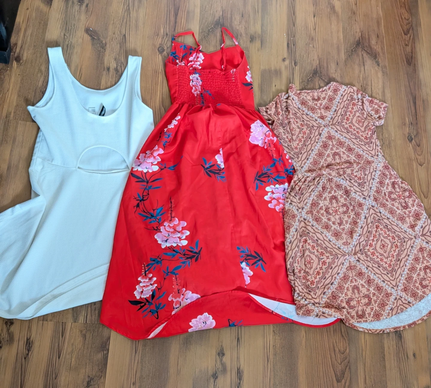 Three stylish dresses perfect for your wardrobe. Includes a white sleeveless dress, a vibrant red floral print maxi dress, and a patterned short-sleeve dress. Great for various occasions!