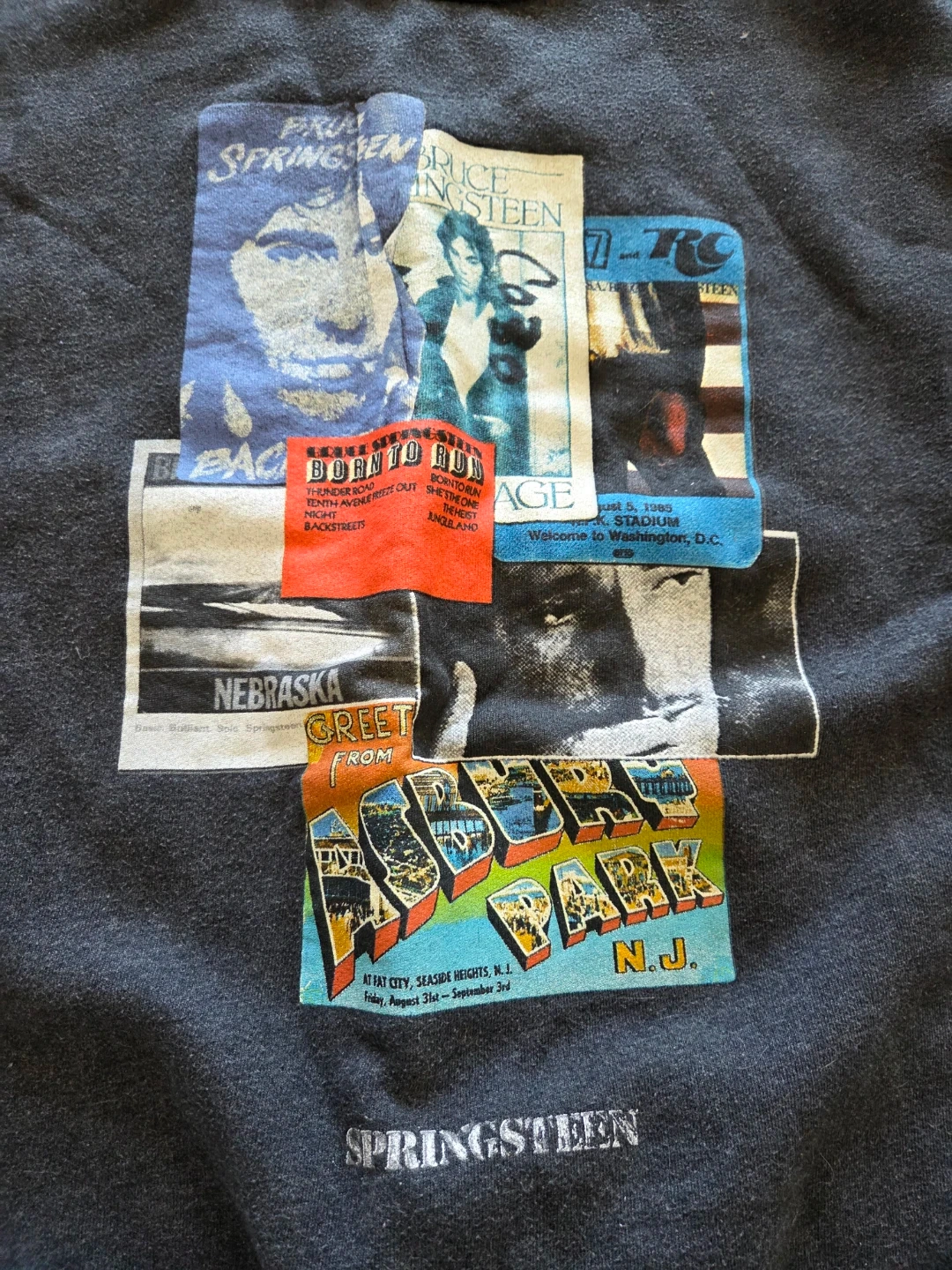 Grey crewneck sweatshirt featuring a collage of Bruce Springsteen album art and tour graphics. It's an XL size with long sleeves. This sweatshirt is great for any Bruce Springsteen fan! It is make in the USA and is from American Apparel