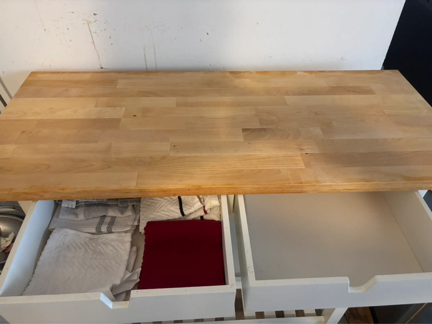 This is the IKEA FÖRHÖJA kitchen cart in birch and white. It's got two drawers and a slatted shelf below. The countertop is solid wood.