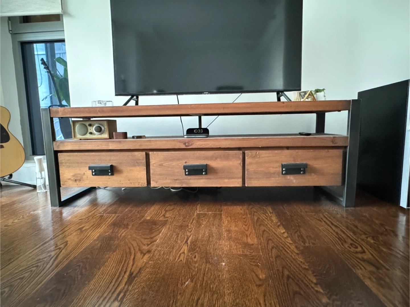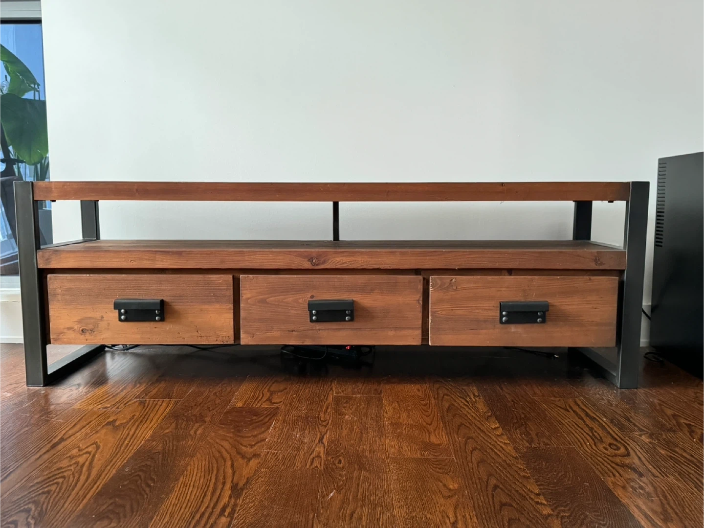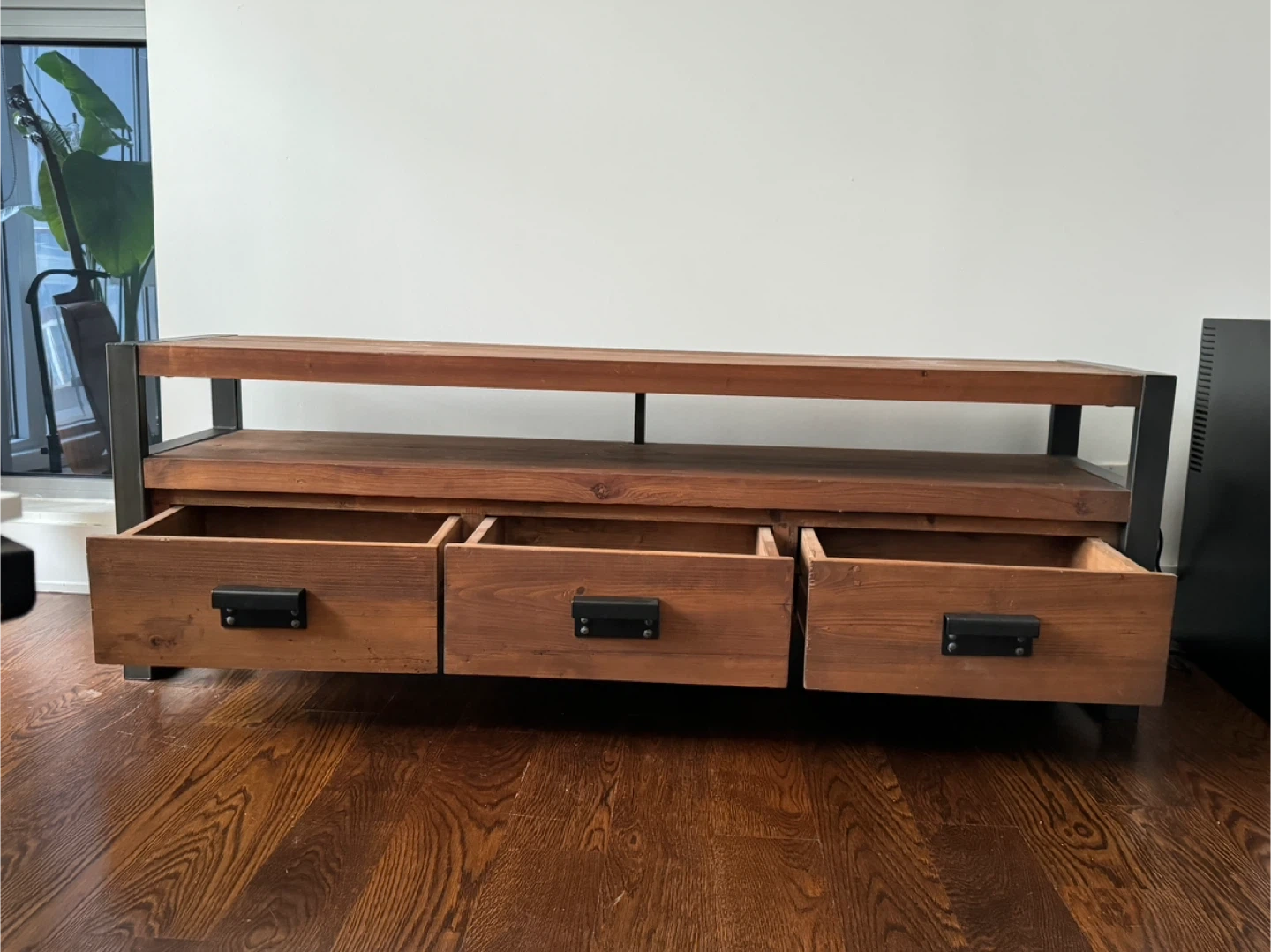 West Elm Rustic wooden TV stand with a metal frame. It features three spacious drawers for storage. This stand has a modern industrial design. Great condition!