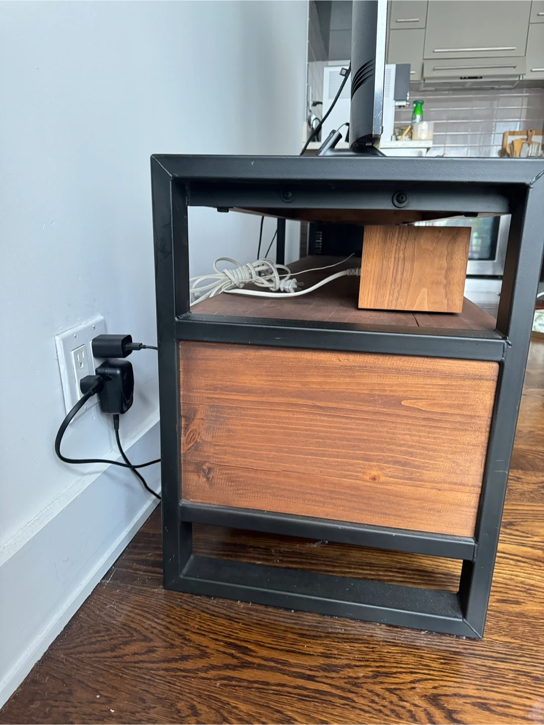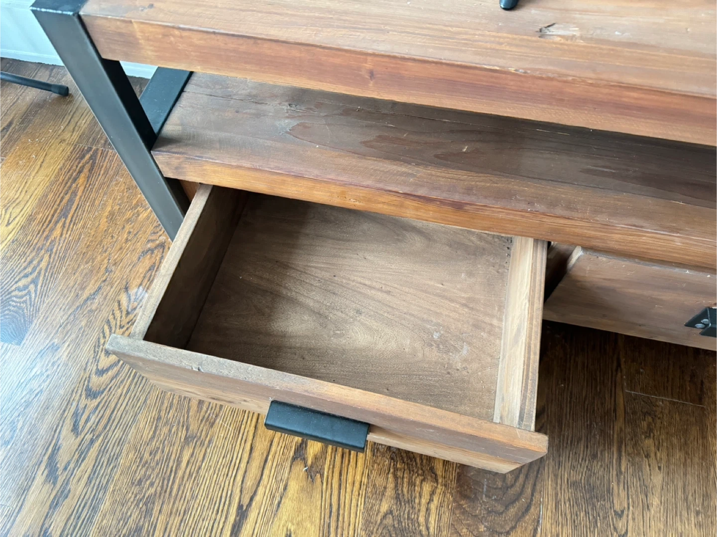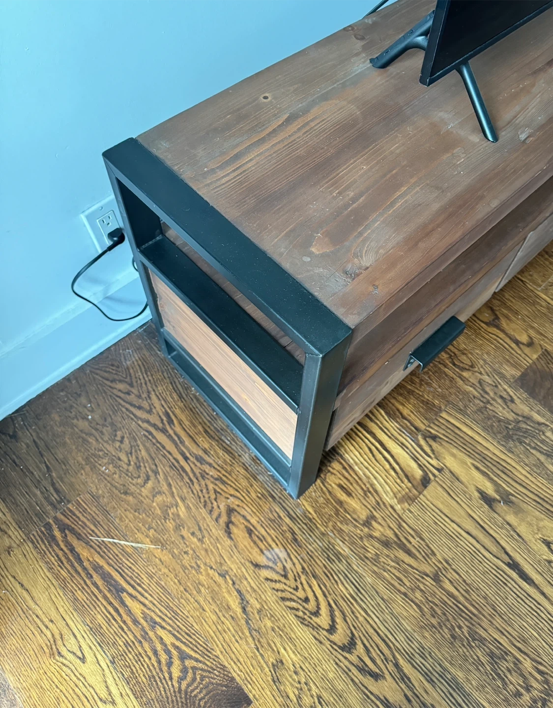 West Elm Rustic wooden TV stand with a metal frame. It features three spacious drawers for storage. This stand has a modern industrial design. Great condition!