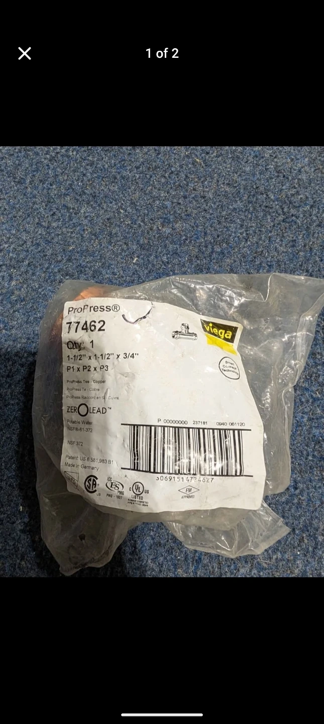 Selling a Viega ProPress copper fitting, model 77462. It's a 1-1/2" x 1-1/2" x 3/4" size, and it's lead-free. Perfect for your plumbing needs!