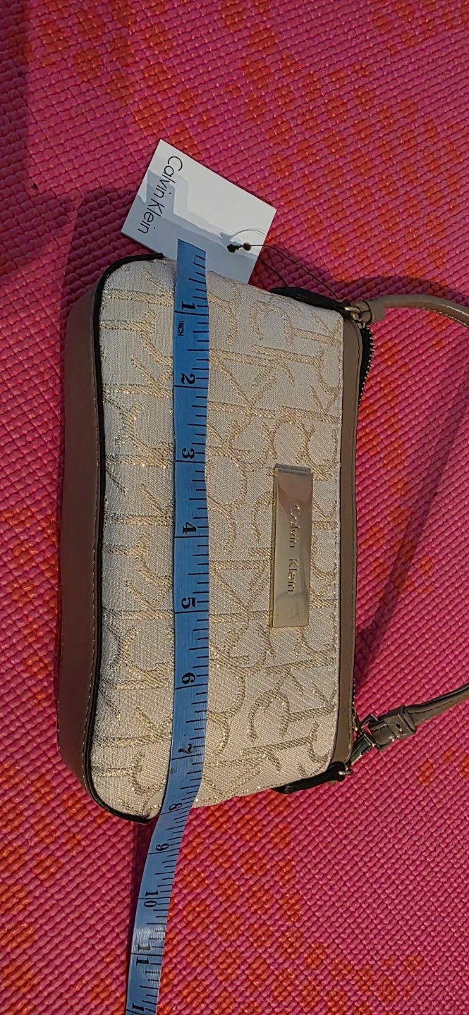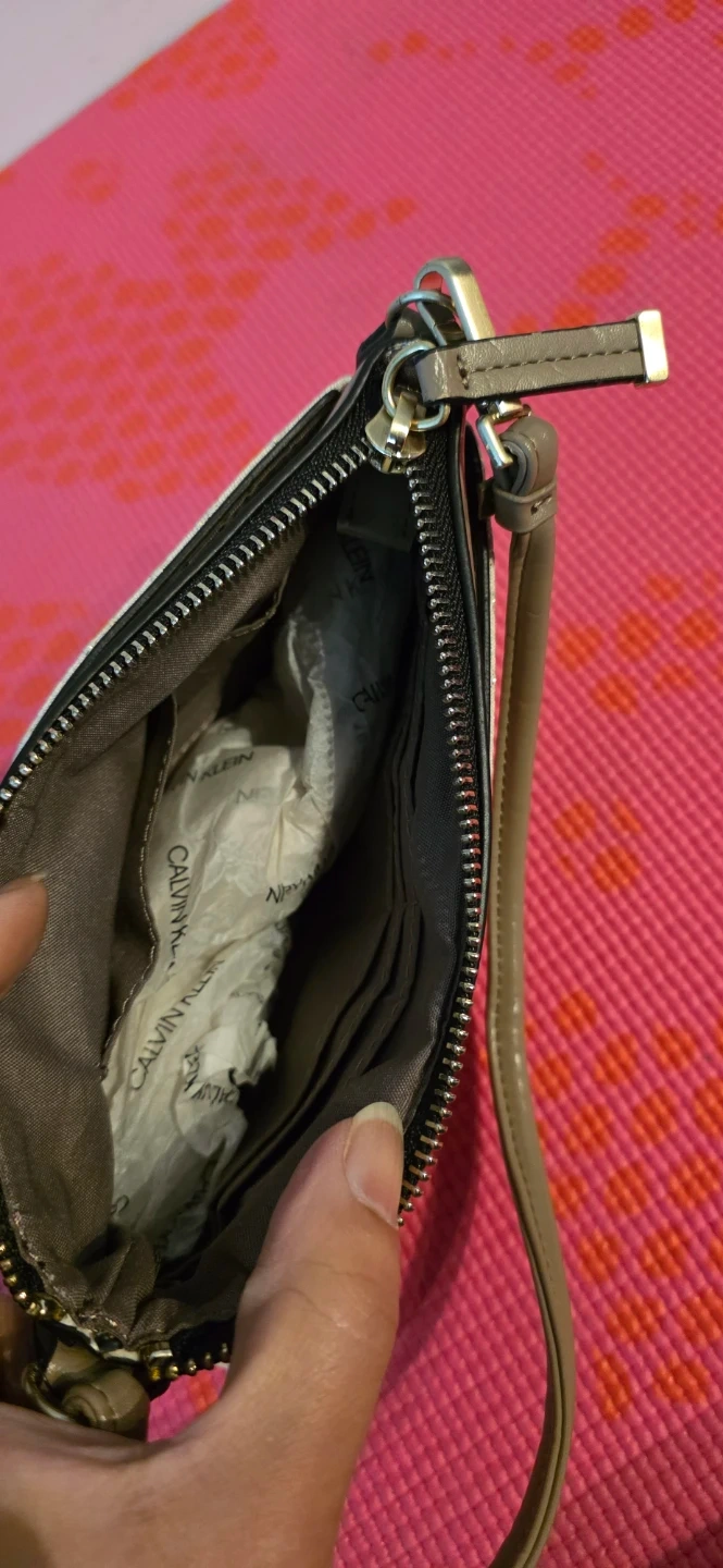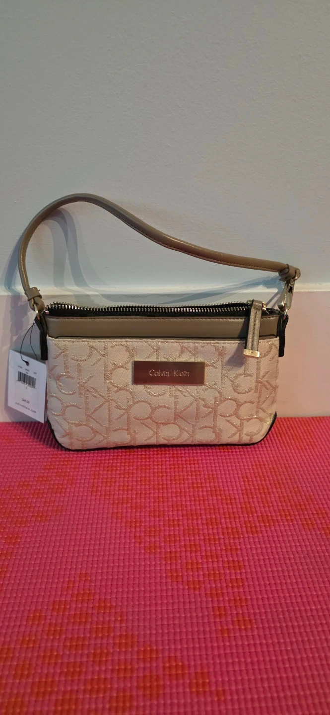 Brand new, with tag, Calvin Klein wristlet pouch, beige with a gold monogram print. It features a secure zippered closure and a wrist strap. Perfect for carrying essentials on the go! A pocket in the front and one in the back. Also, multi card slots and small pocket in the center pocket.