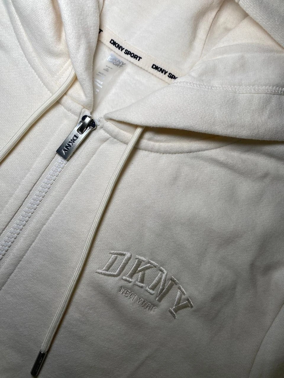 This is a DKNY Sport zip-up hoodie in a cream colour. It's a size medium and made of cotton. It's perfect for casual wear or light workouts! Women's