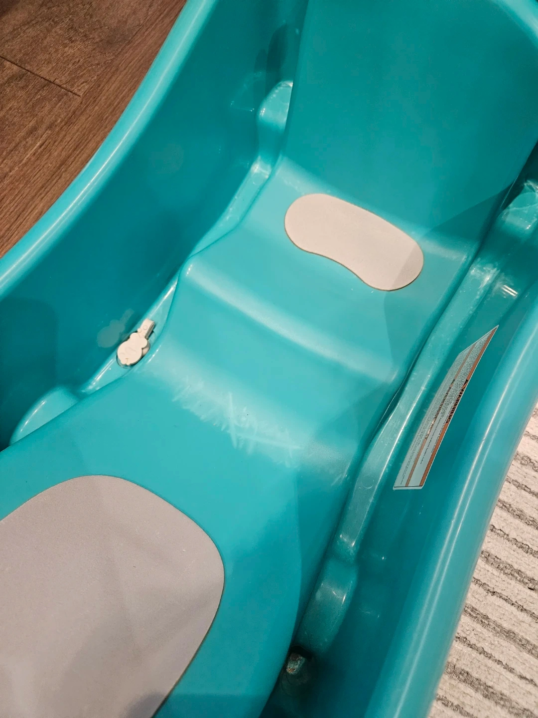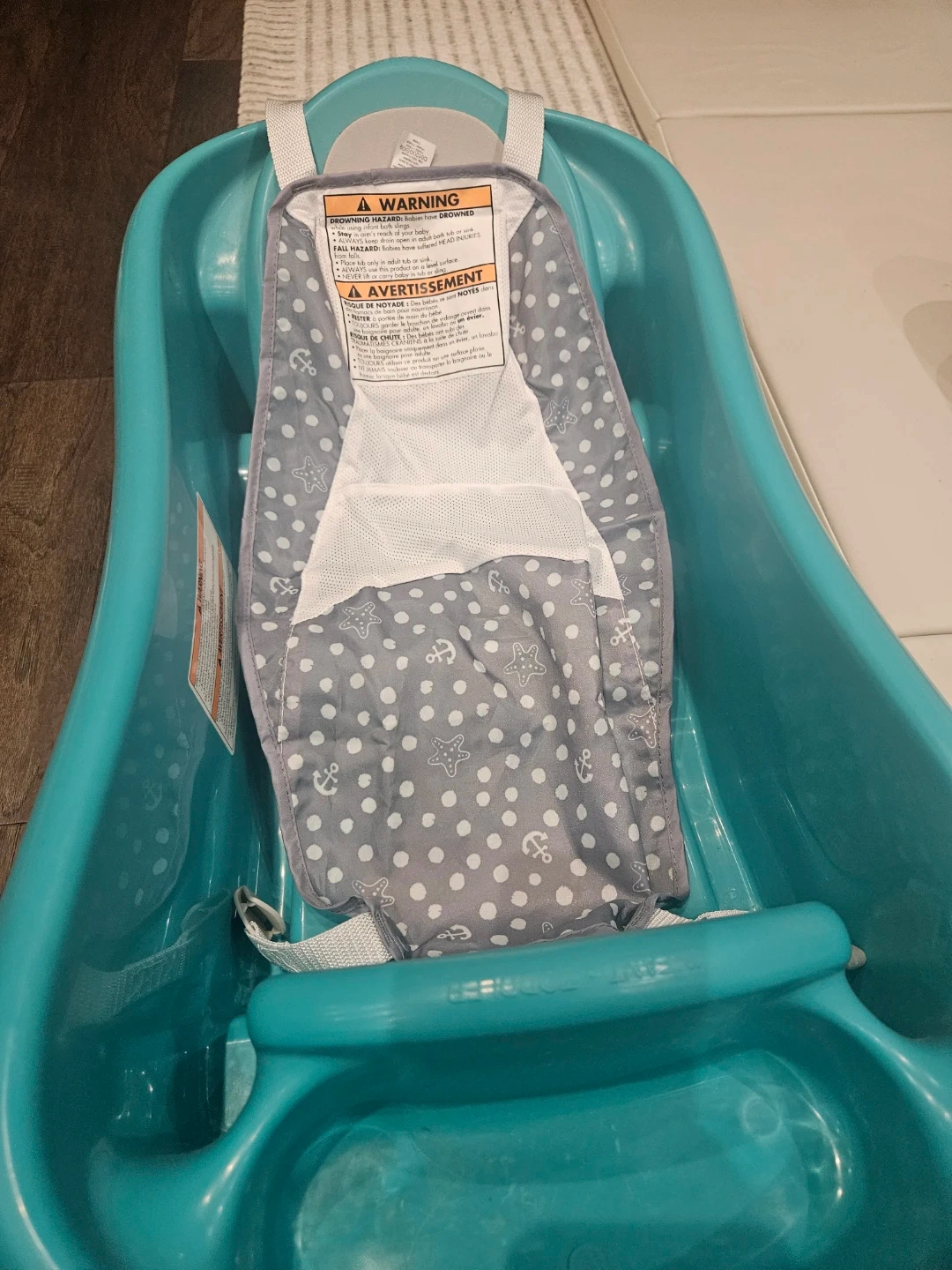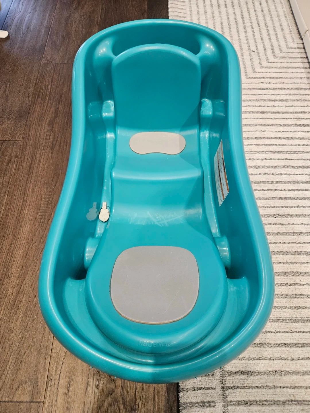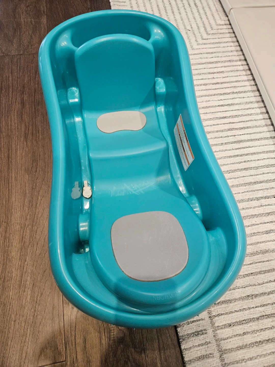 This teal baby tub by The First Years is designed for newborns up to 25 lbs. It comes with a supportive sling for infants. The non-slip surface helps keep baby secure.