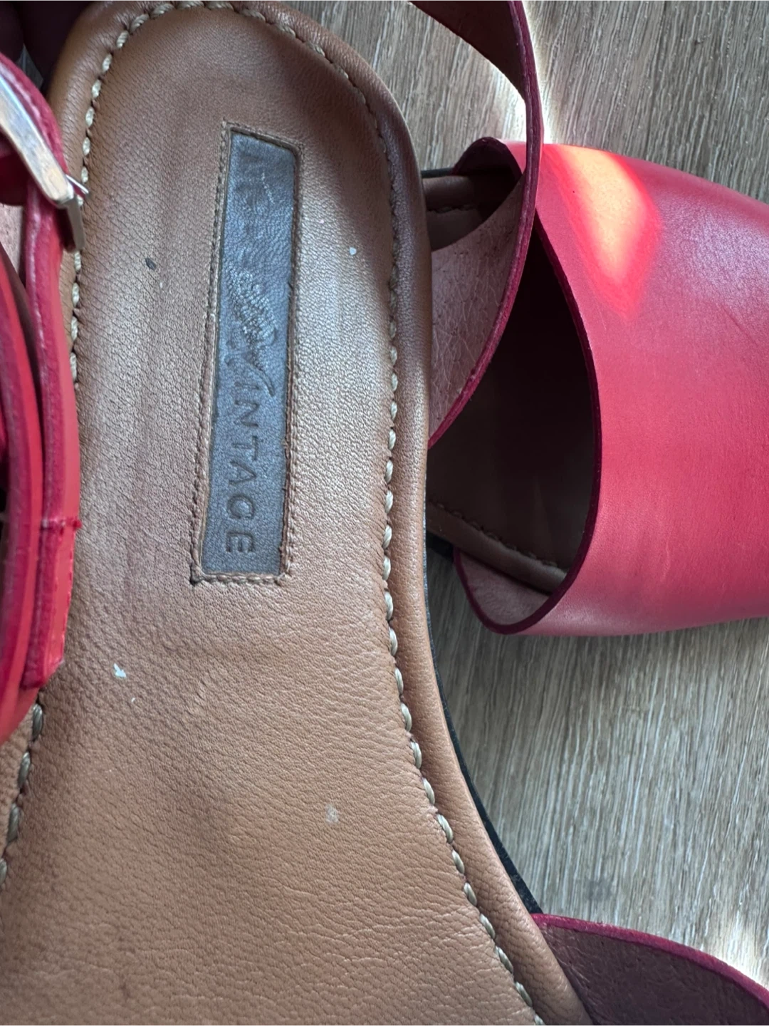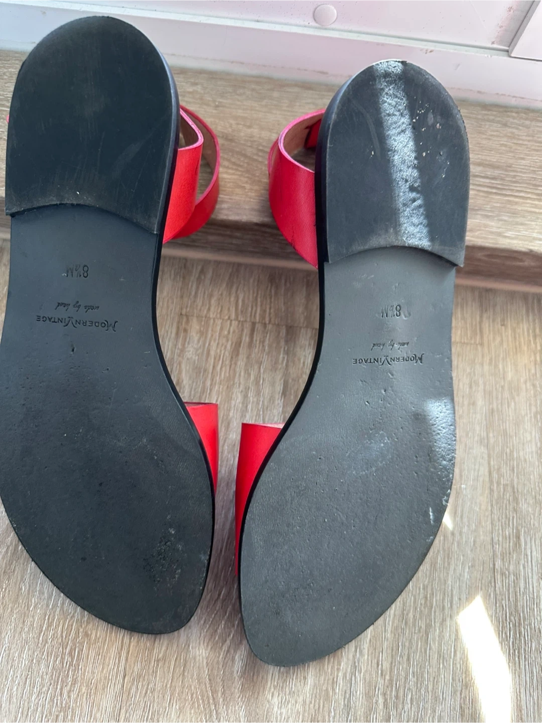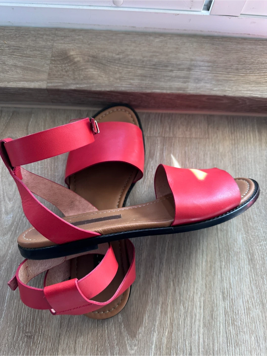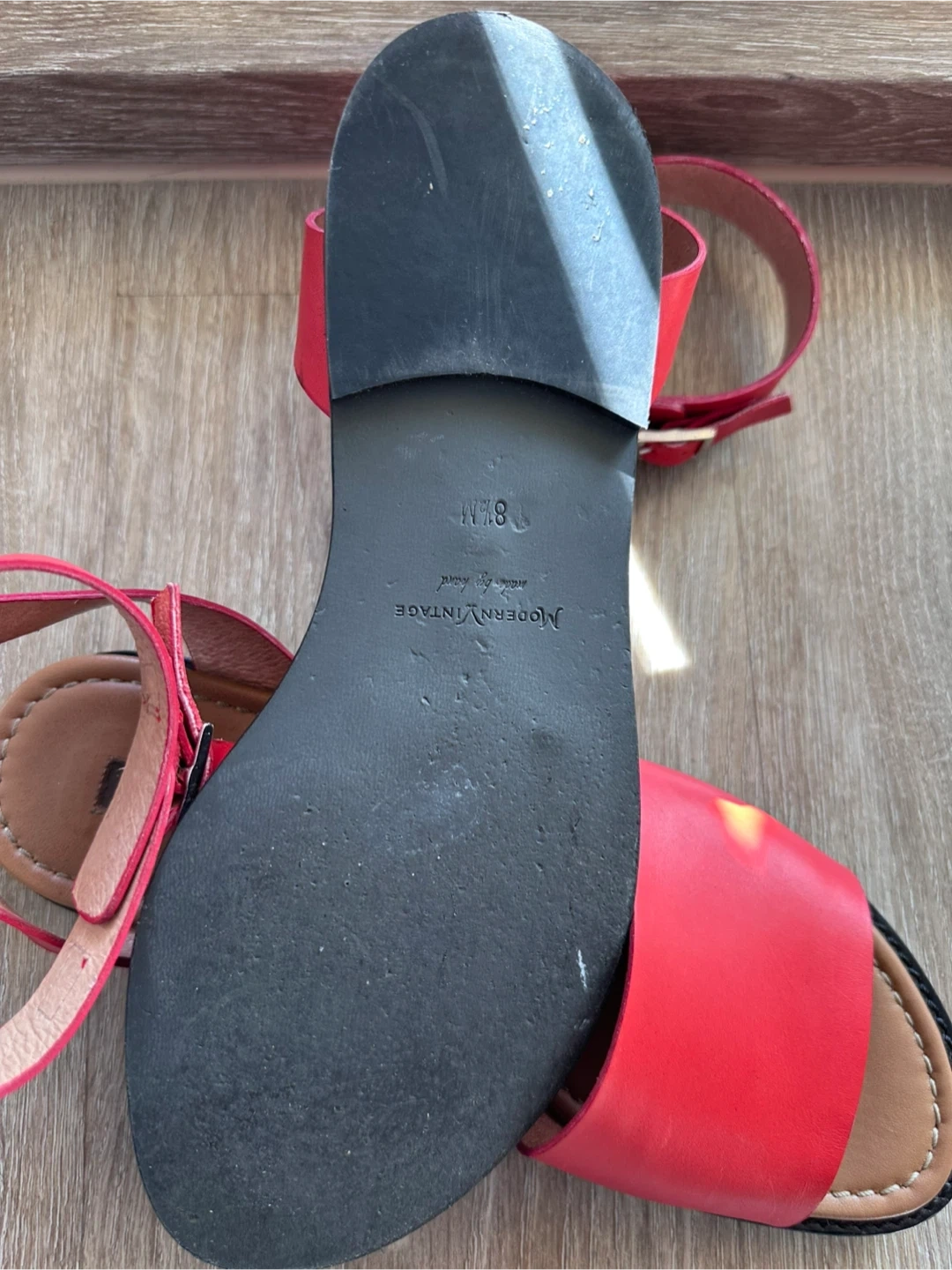These red leather sandals feature an adjustable ankle strap with a buckle closure. The footbed appears to be made of genuine leather. They offer a comfortable, flat sole for everyday wear. Handmade