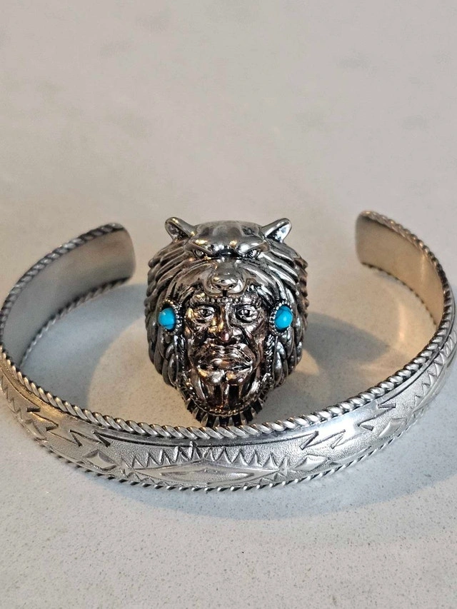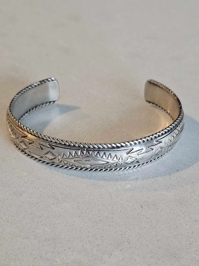 Up for grabs is this stunning, authentic-style Navajo cuff bracelet that's perfect for adding a touch of boho-chic or Western flair to your wardrobe! Crafted from high-quality sterling silver, this piece features exquisite hand-engraved details inspired by traditional Native American motifs—think lightning zigzags, diamond arrowheads, and chevron patterns framed by twisted rope borders. It's got that timeless Southwestern vibe, reminiscent of pieces from the Navajo silversmiths of the American Southwest. Condition: Used - Like new. Cash accepted: Yes. Payment: Cashless payment, Cash accepted.