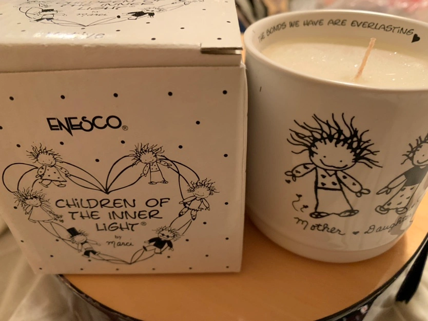A ceramic candle by Enesco featuring the "Children of the Inner Light" design. The candle is in the shape of a mug and has a single wick. It reads "The bonds we have are everlasting" on the side. Mother-daughter