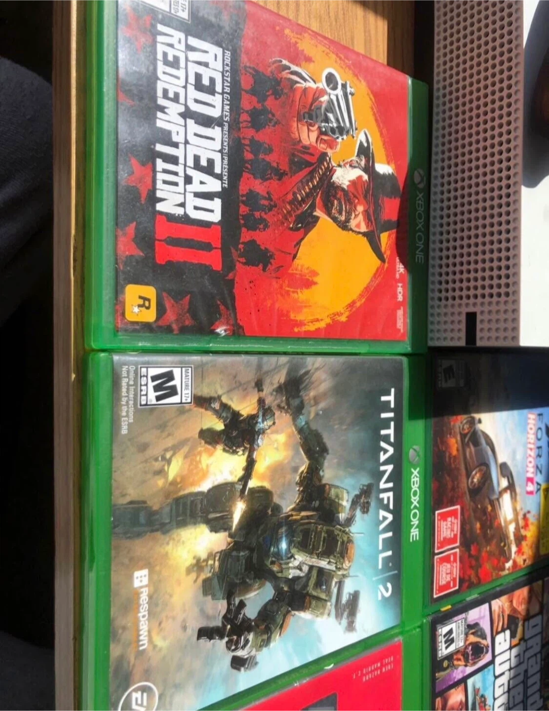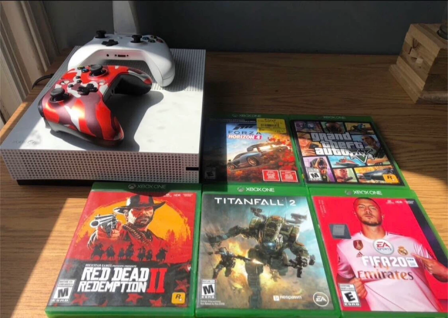 Selling an Xbox One S console. Includes one white controller and one red camouflage controller. Great for gaming! With 5 games