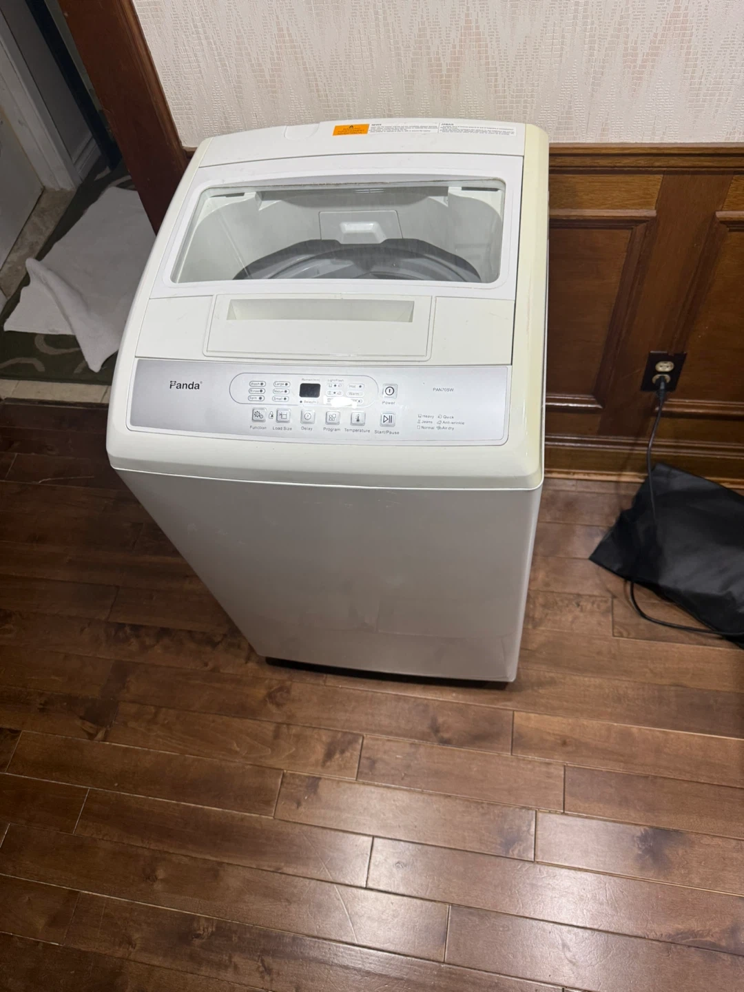 This is a Panda brand portable top-load washing machine. It's compact and suitable for small spaces. The unit features multiple wash cycles and a transparent lid.