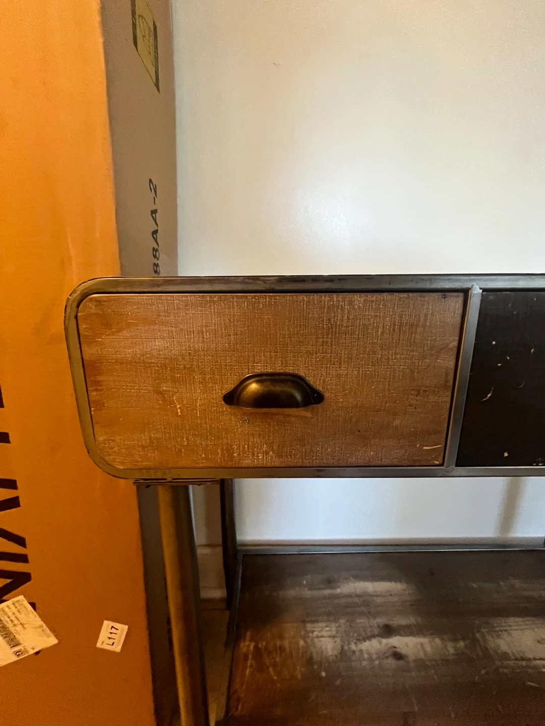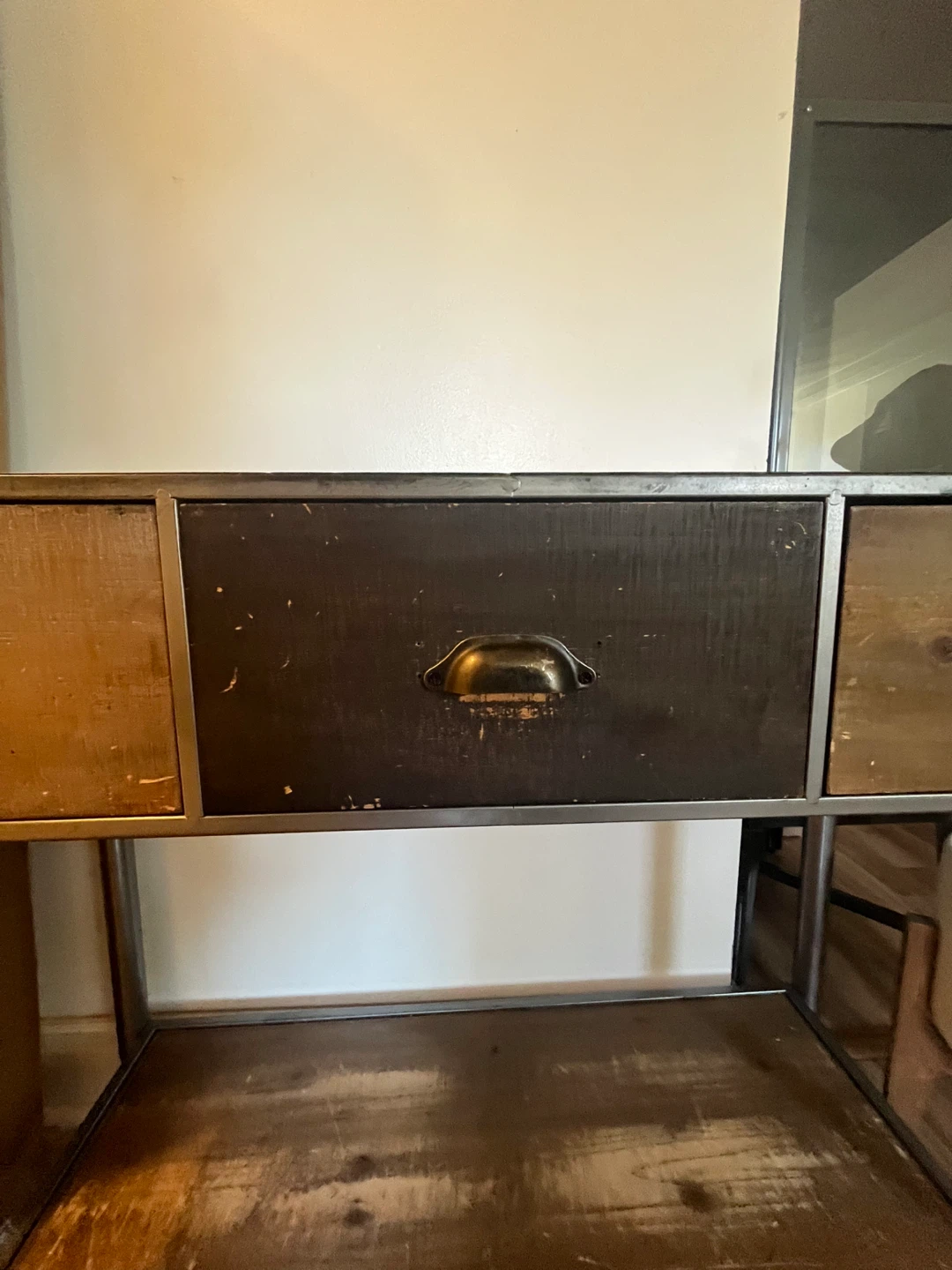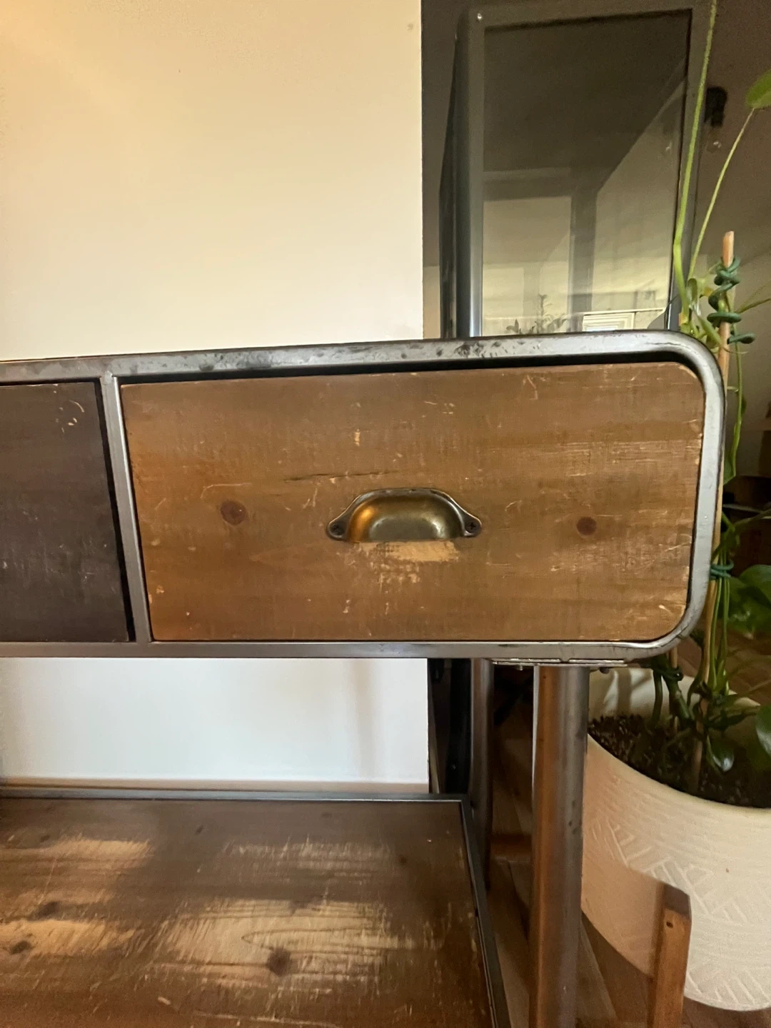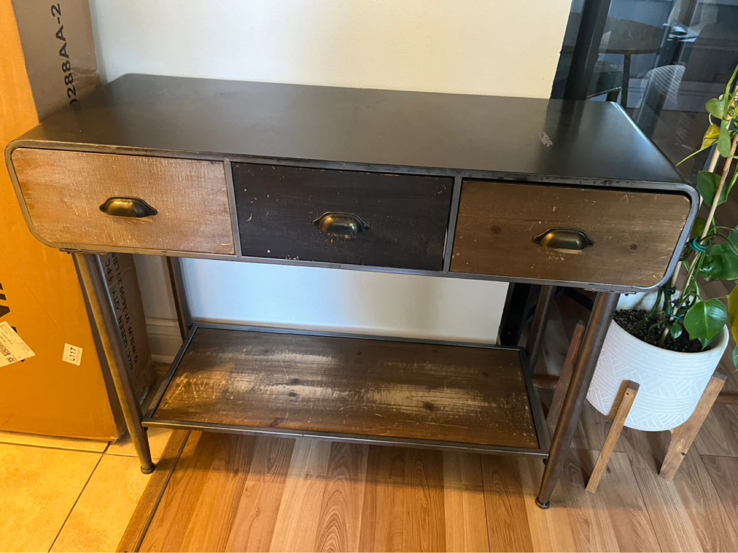 Beautiful steel and wood console table with 3 spacious drawers—perfect for storing keys, mail, and everyday essentials while keeping your space tidy.