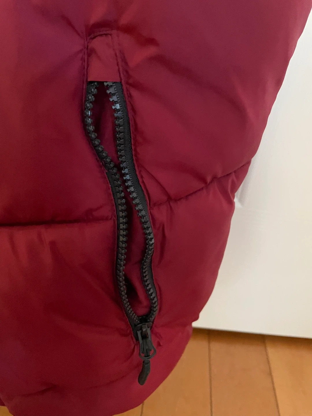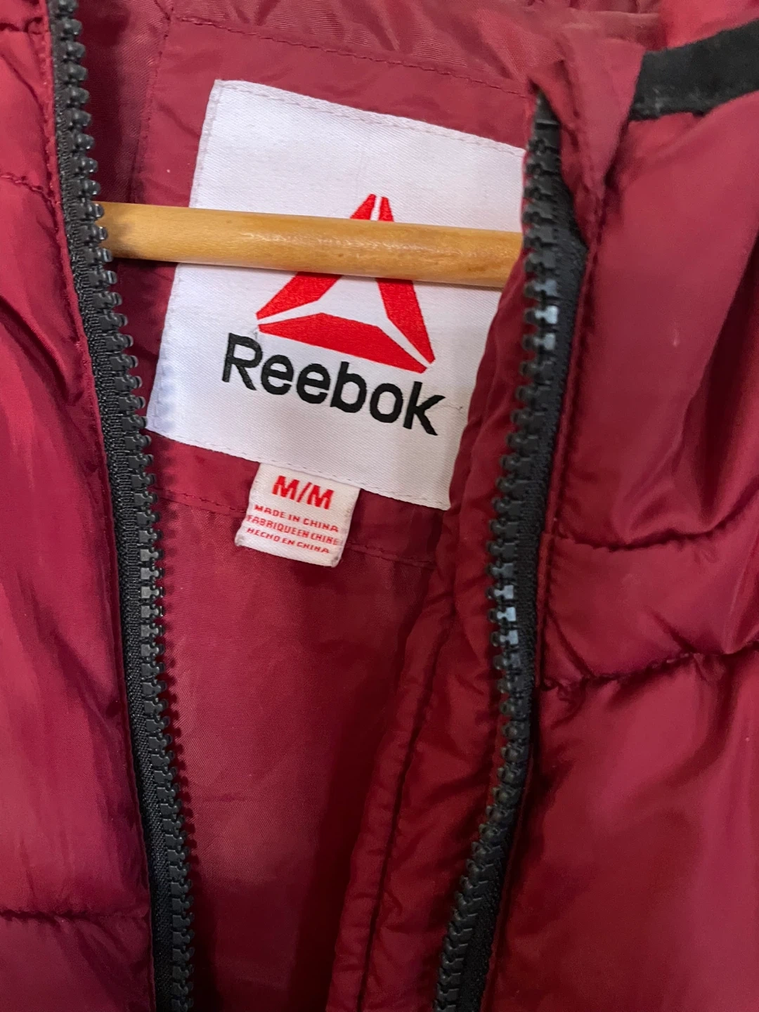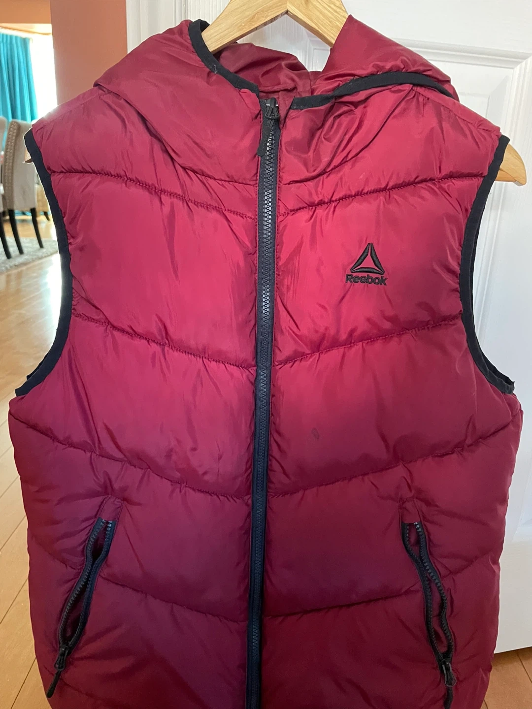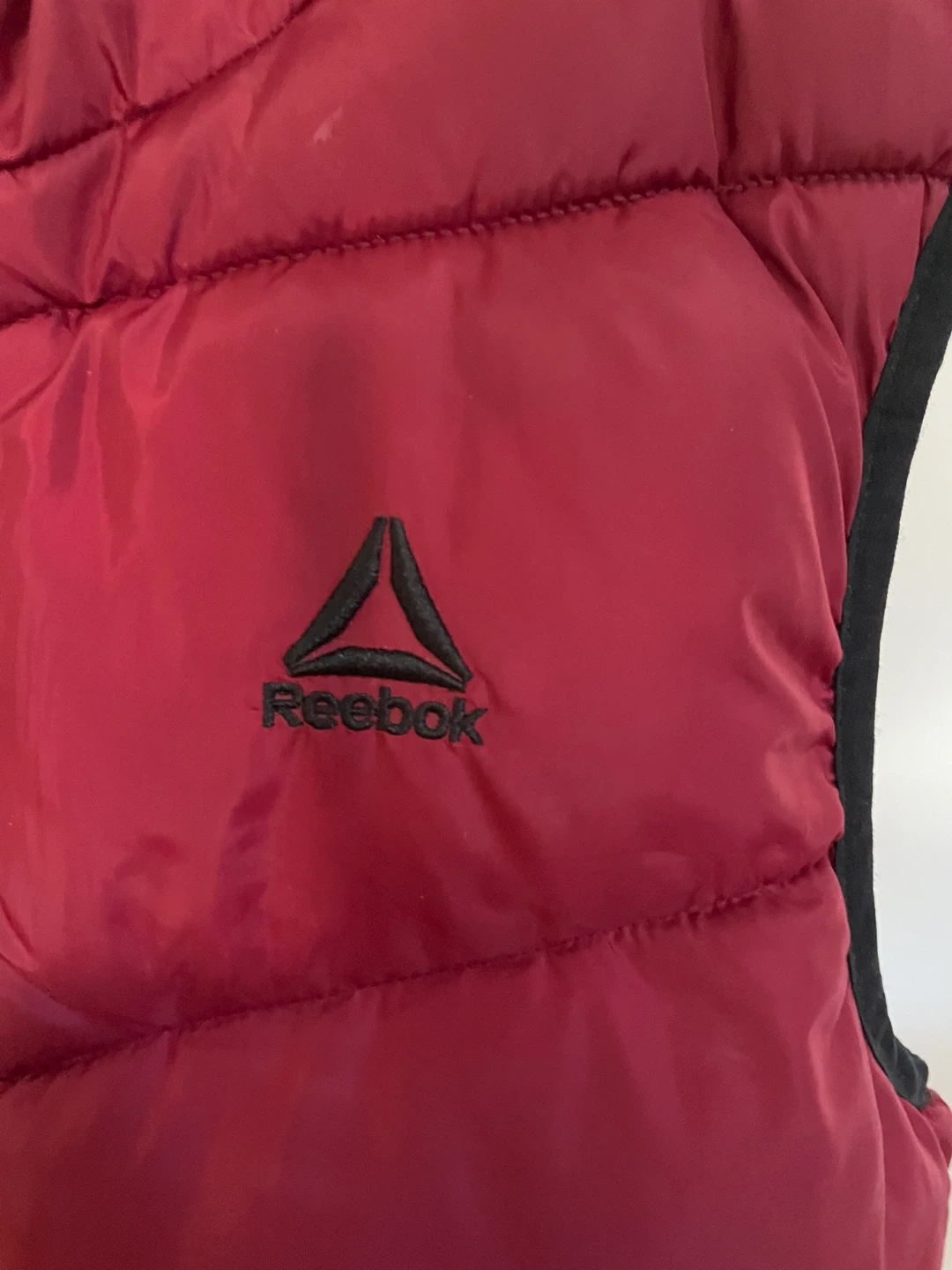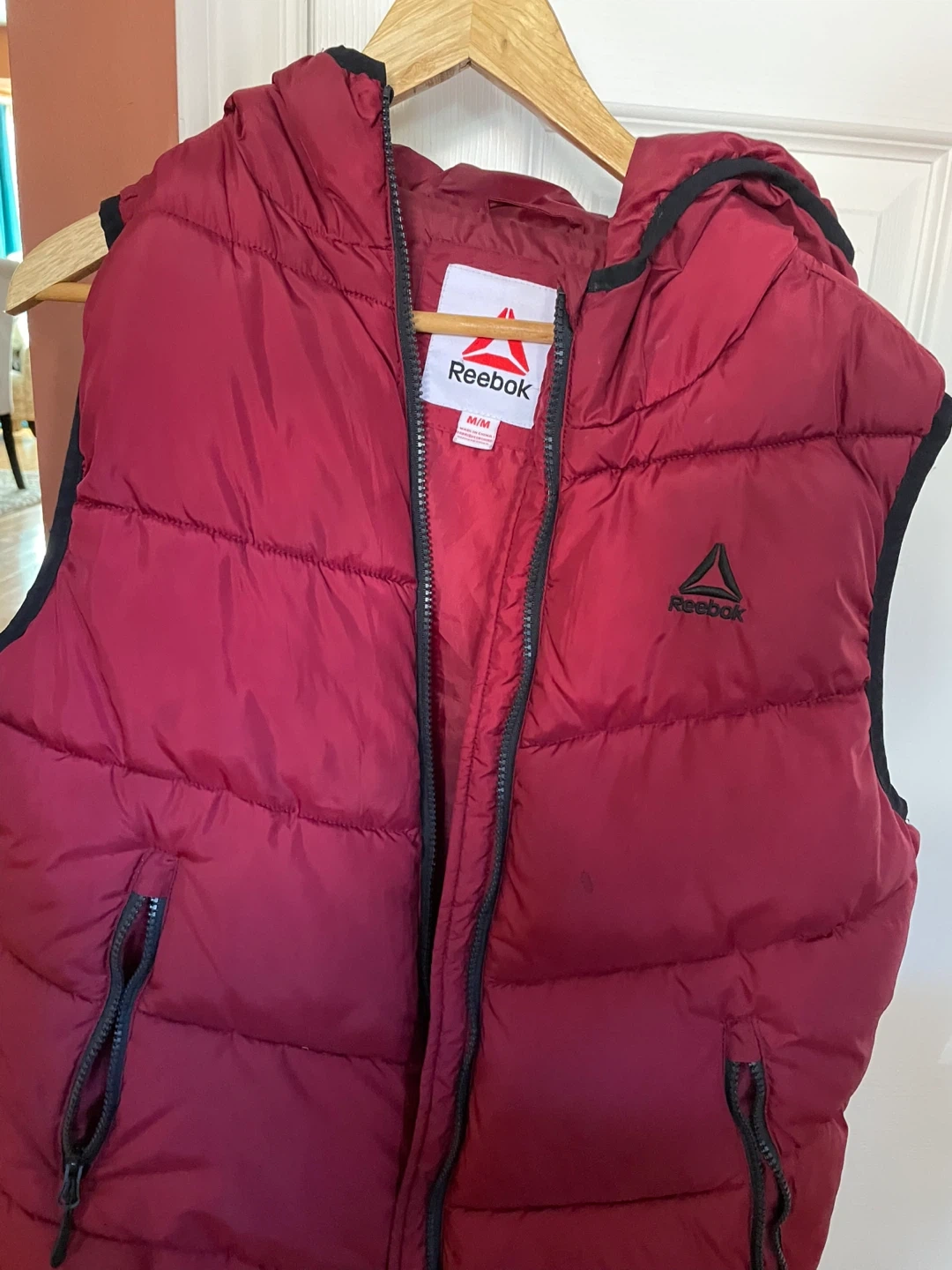 Reebok puffer vest in a deep red colour. It's a size M/M. Features zippered pockets on the front. Great for layering during cooler weather!