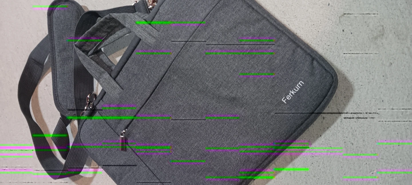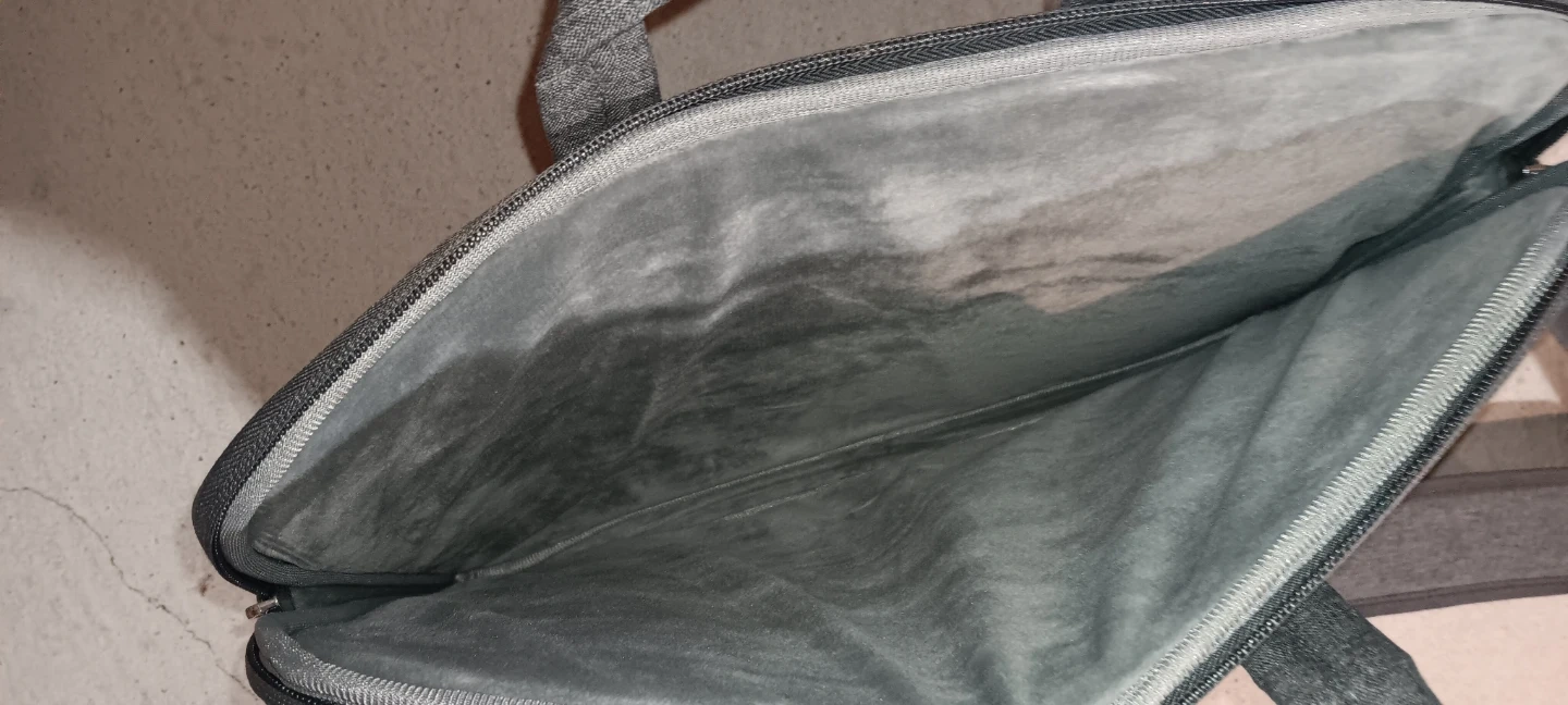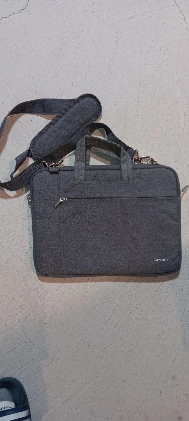 This Ferkurn laptop bag is made of grey fabric. It features a padded interior and a detachable shoulder strap. It has a zippered front pocket for accessories.