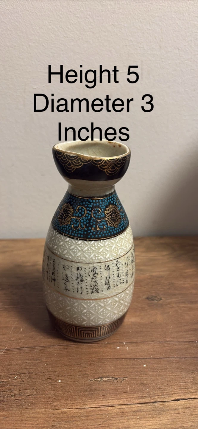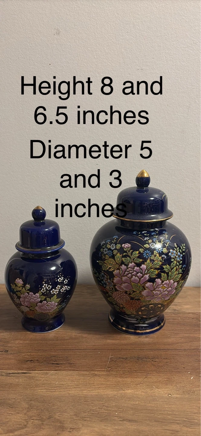 A collection of decorative ceramic pieces featuring intricate designs and vibrant colours. Includes two large vases (10 and 11 inches tall), two lidded jars (8 and 6.5 inches tall with 5 and 3 inch diameters respectively), a small amphora-style vase (6 inches tall with 4 inch diameter), a small jug, and a decorative plate (6 inch diameter).