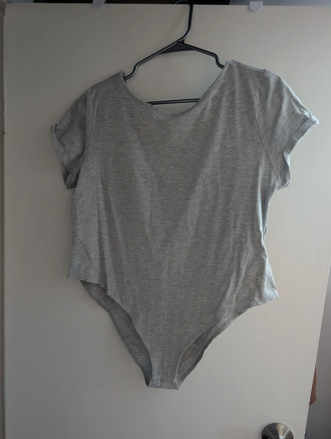 A comfy grey short sleeve bodysuit. It's made of a soft fabric blend. This bodysuit is great for layering or wearing on its own!
