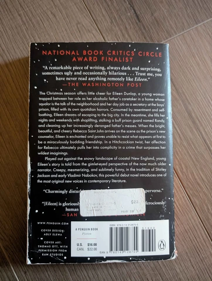 Award-winning novel 'Eileen' by Ottessa Moshfegh. This paperback is a PEN/Hemingway Winner and was shortlisted for the Man Booker Prize. Also a National Book Critics Circle Award finalist. Story is dark and surprising, with a Hitchcockian twist. Features Eileen Dunlop, a young woman working as a secretary at a boys' prison, with a creepy, mesmerizing vibe. Back cover has a sticker.