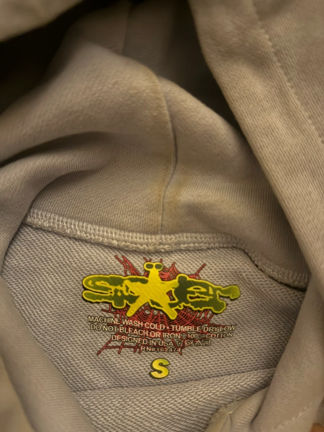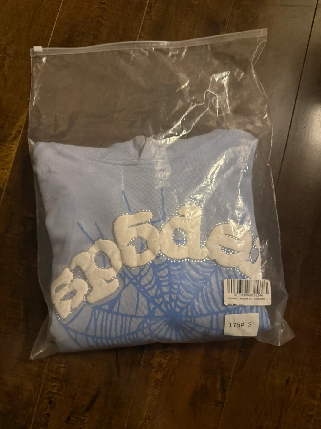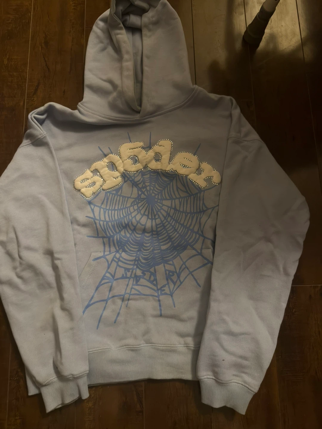 Light blue Sp5der hoodie with a web design and rhinestone.Made from 100% cotton.