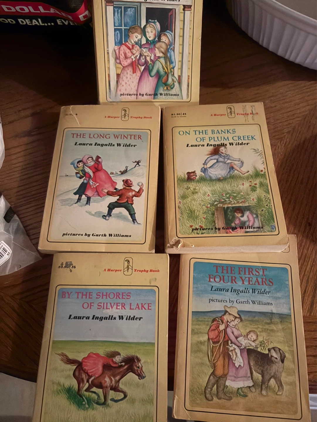 Set of four Little House on the Prairie books by Laura Ingalls Wilder. Includes 'The Long Winter', 'On the Banks of Plum Creek', 'By the Shores of Silver Lake', and 'The First Four Years'. Pictures are by Garth Williams. These are Harper Trophy paperbacks.
