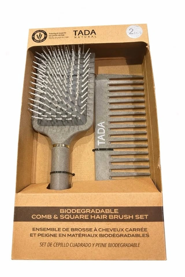 This Tada natural 2-piece biodegradable comb and square hair brush set is an eco-friendly hairbrush designed to detangle and smooth hair effortlessly. It features a square paddle design that provides optimal coverage and minimizes breakage, making it suitable for all hair types.
