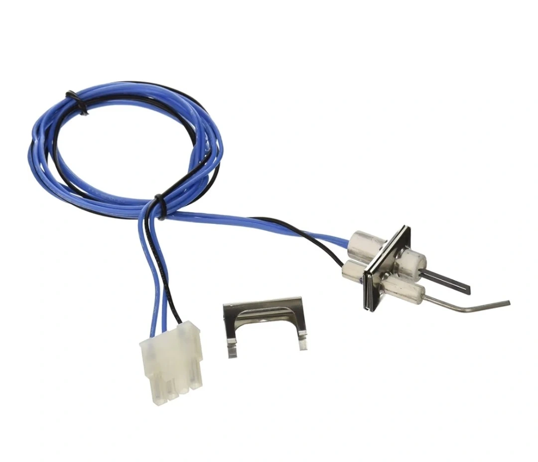 This is a pilot light assembly for a gas furnace. It comes with wires and a connector. It's a replacement part for your heating system.