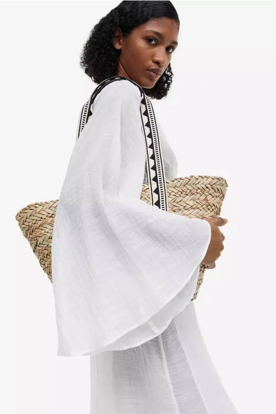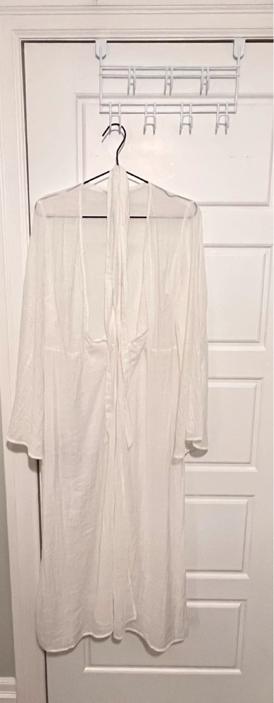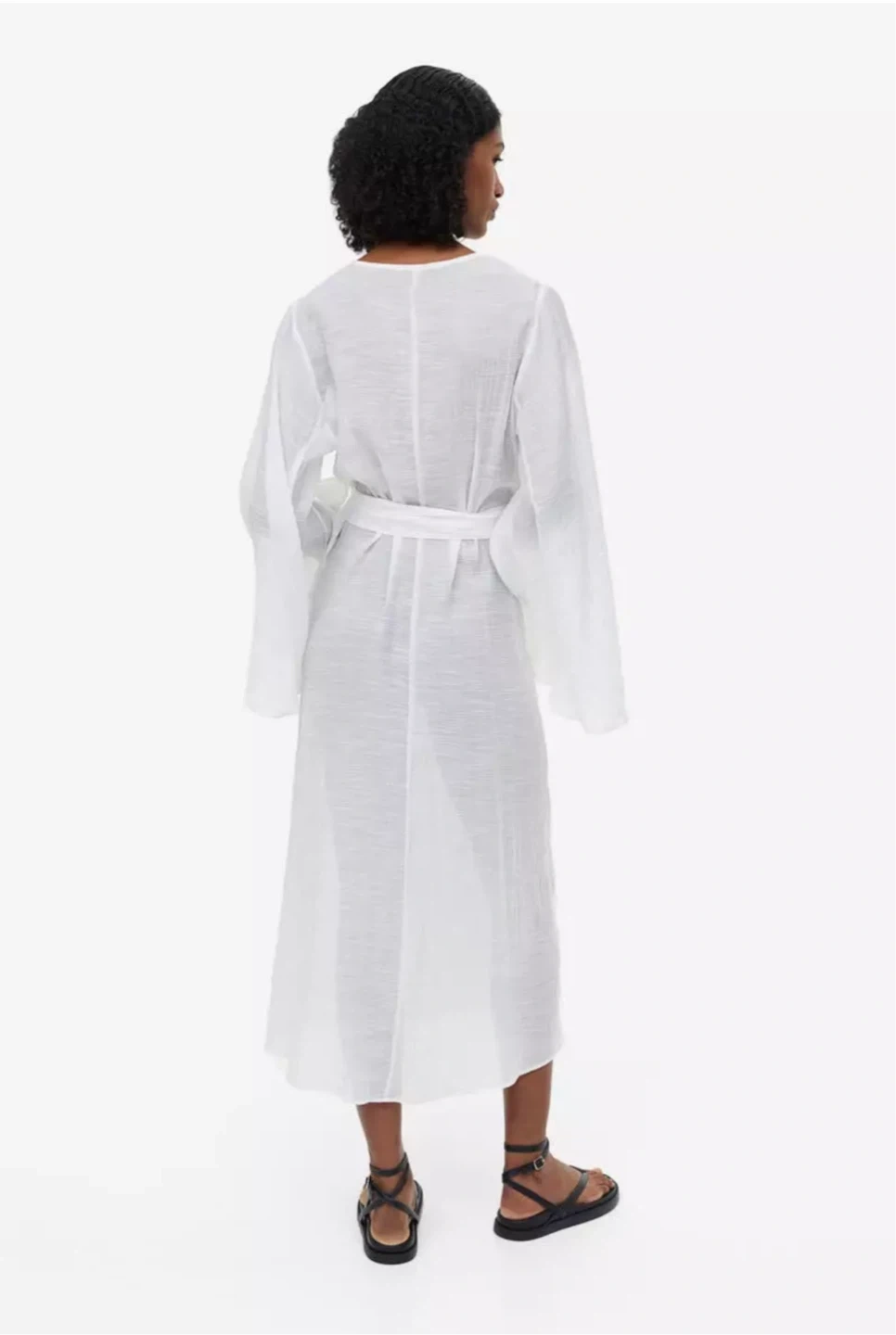 Ankle-length dress in a crêpe weave with a wrapover front that fastens with a tie belt at the waist. Long, flared sleeves. Unlined.