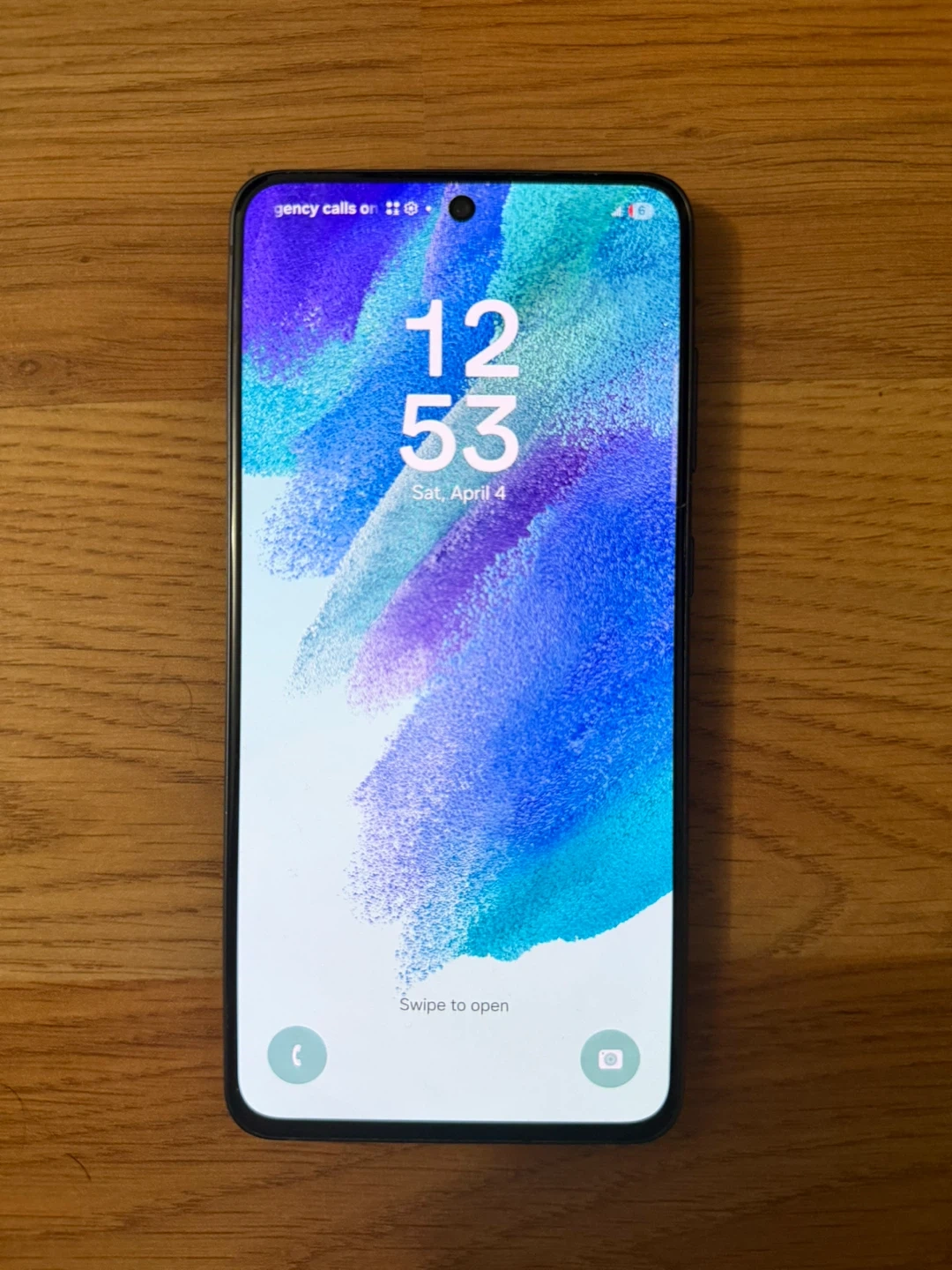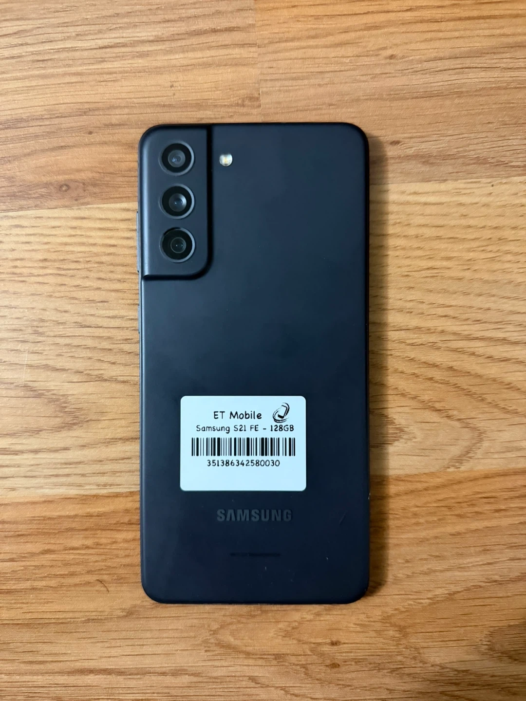 This is a Samsung S21 FE smartphone with 128GB of storage. It's a dark grey colour. This phone's got a dual-camera system on the back. It's unlocked and ready for a new owner!