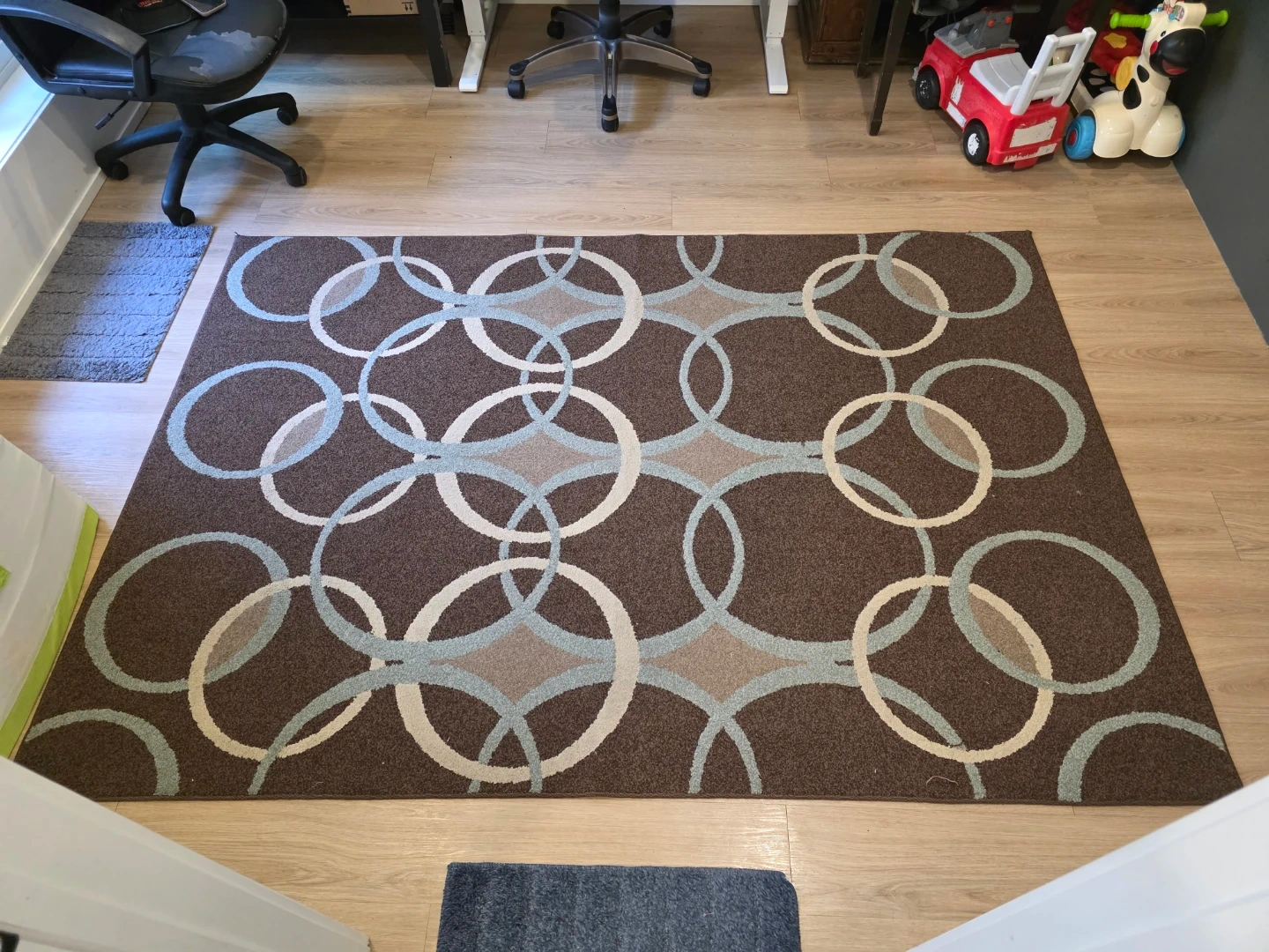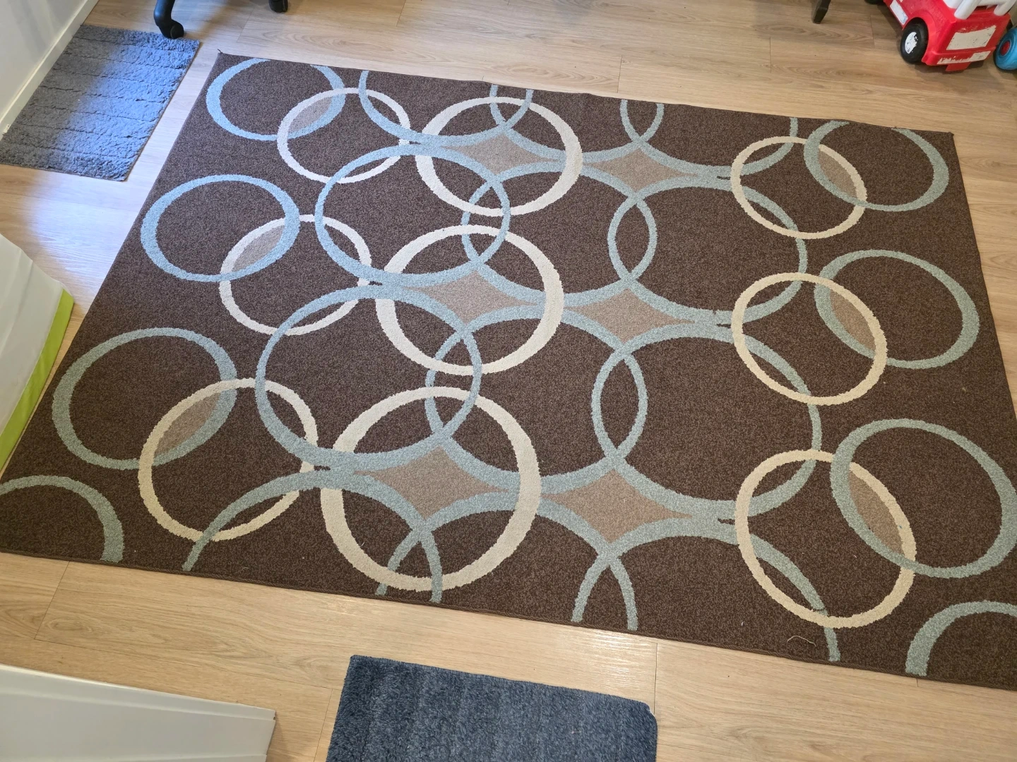 This rectangular rug features a brown base with a repeating pattern of interlocking circles in light blue, grey, and off-white. It's a lovely addition to any room's decor. The rug is made of a soft, durable material. Its dimensions make it suitable for a living room or bedroom.