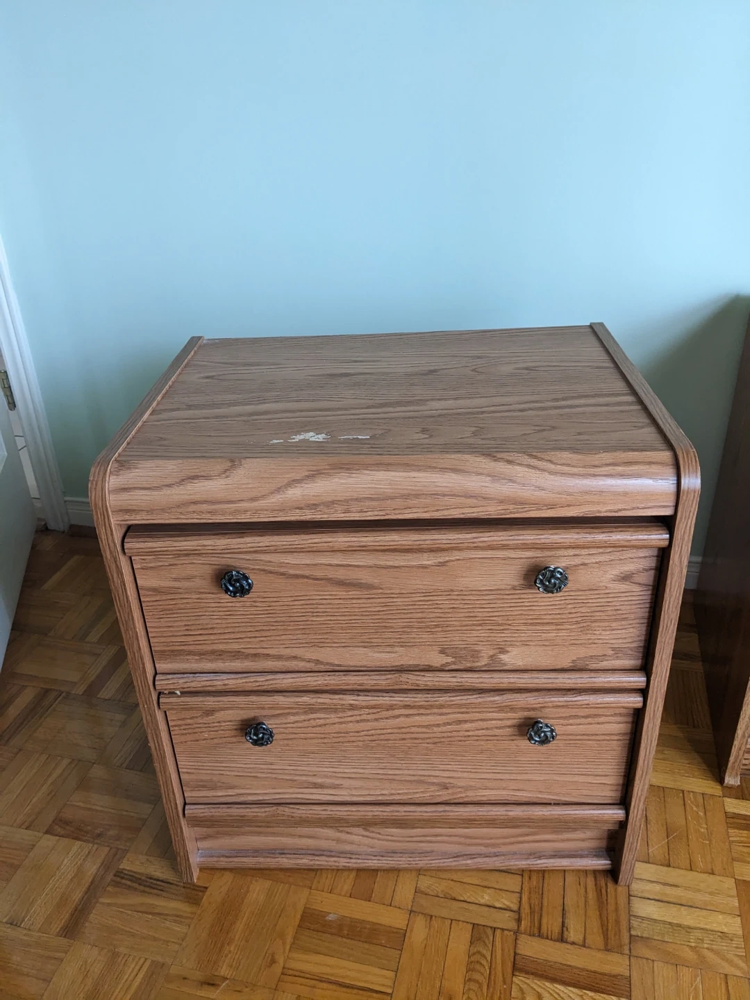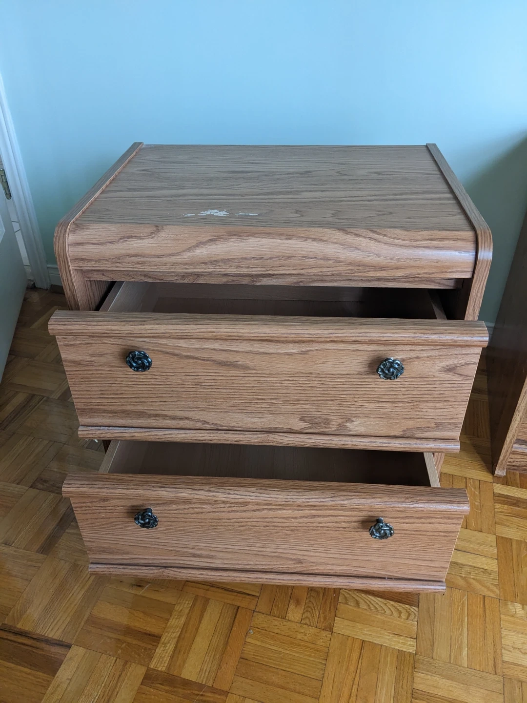 A wooden dresser with three drawers. It's made of wood and has decorative handles. This dresser would be useful for storing clothes or other household items.