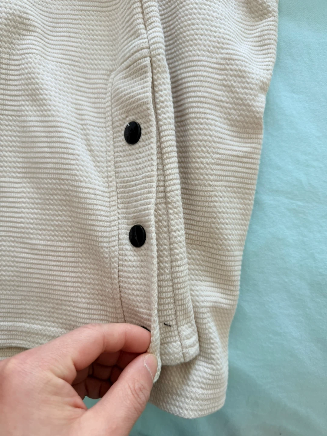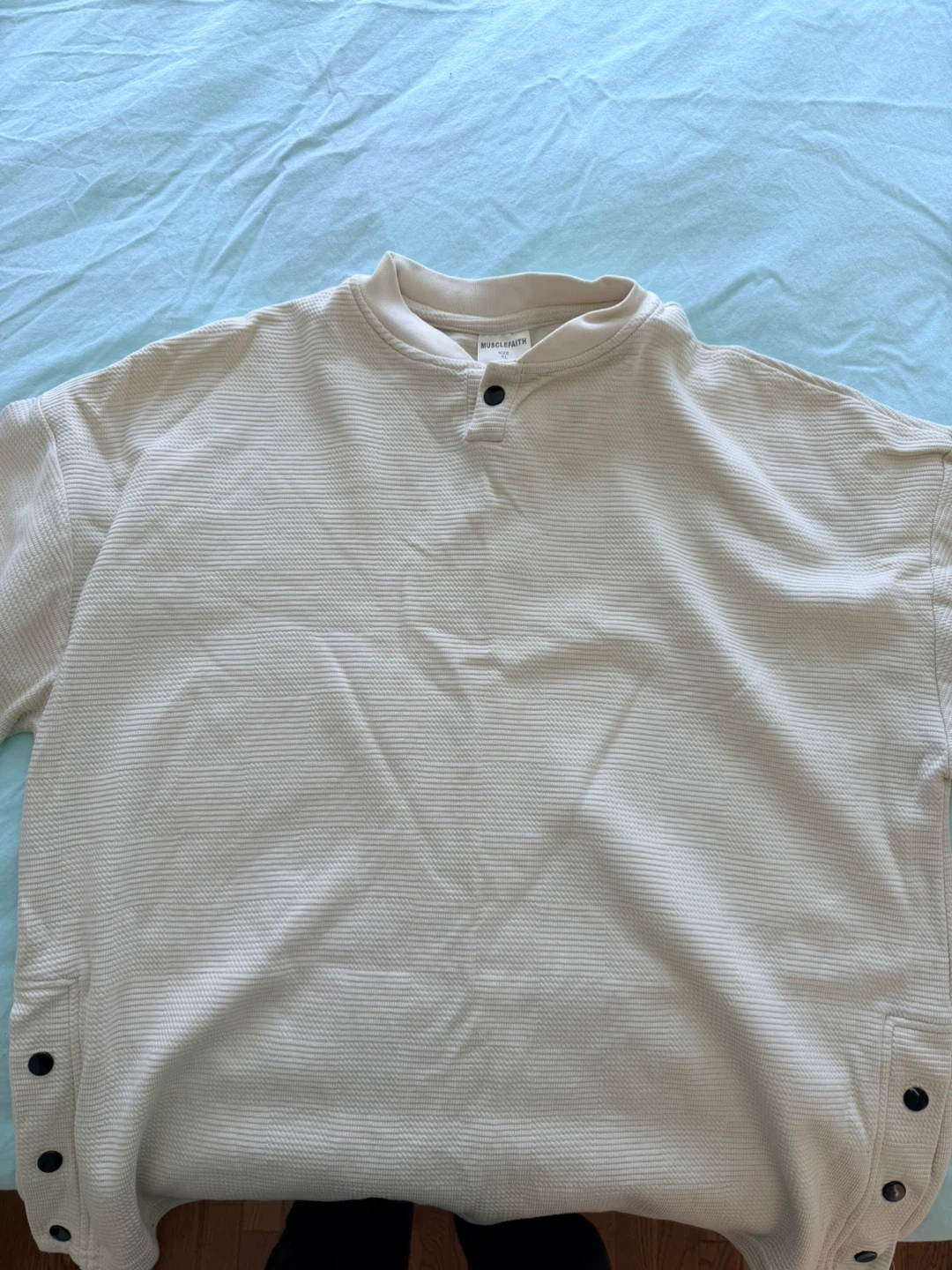 BODIL & BEN long-sleeve sweater with a textured knit. It has a buttoned neck closure on the side and button details on the sides. Thick material size xl