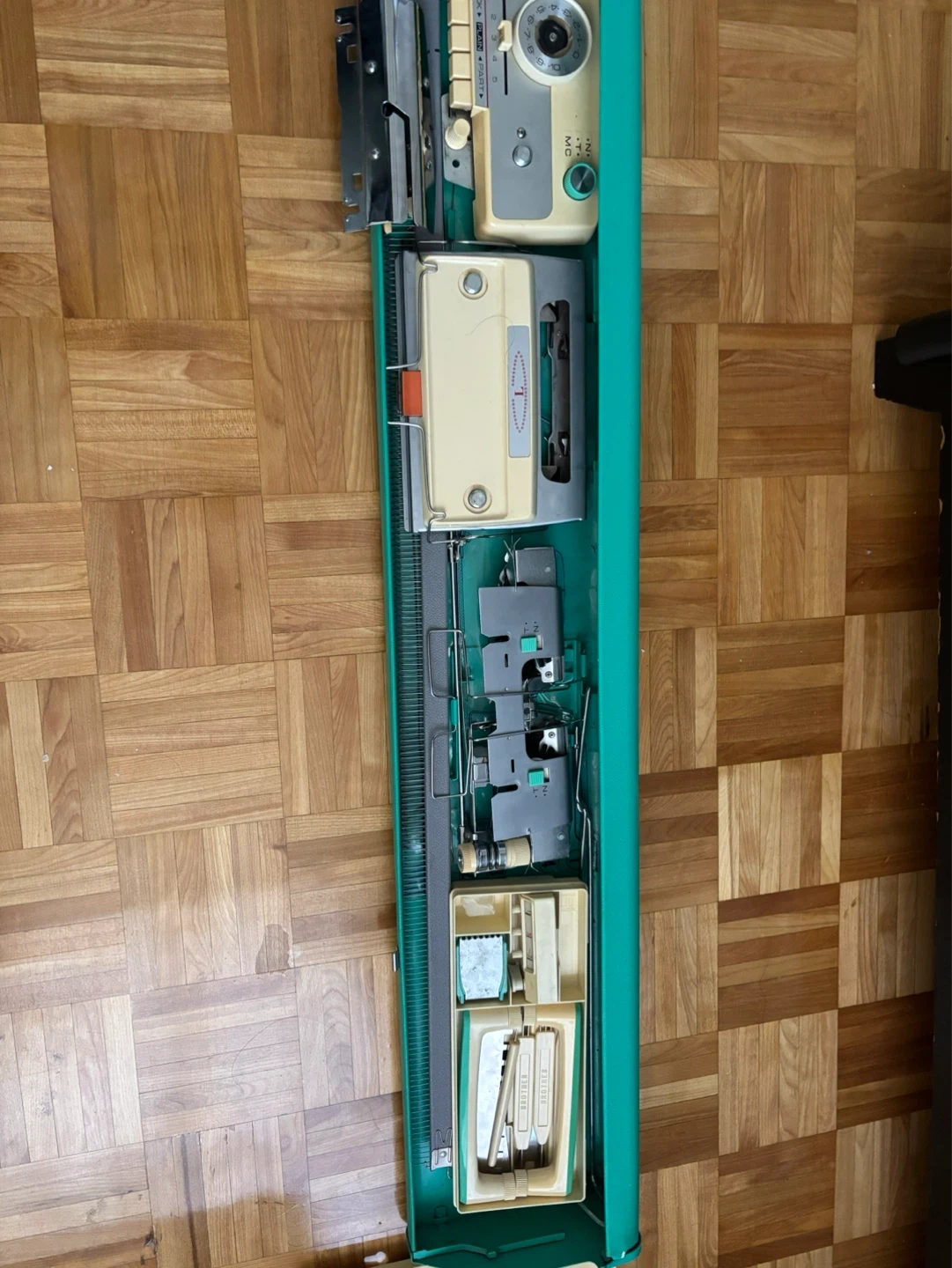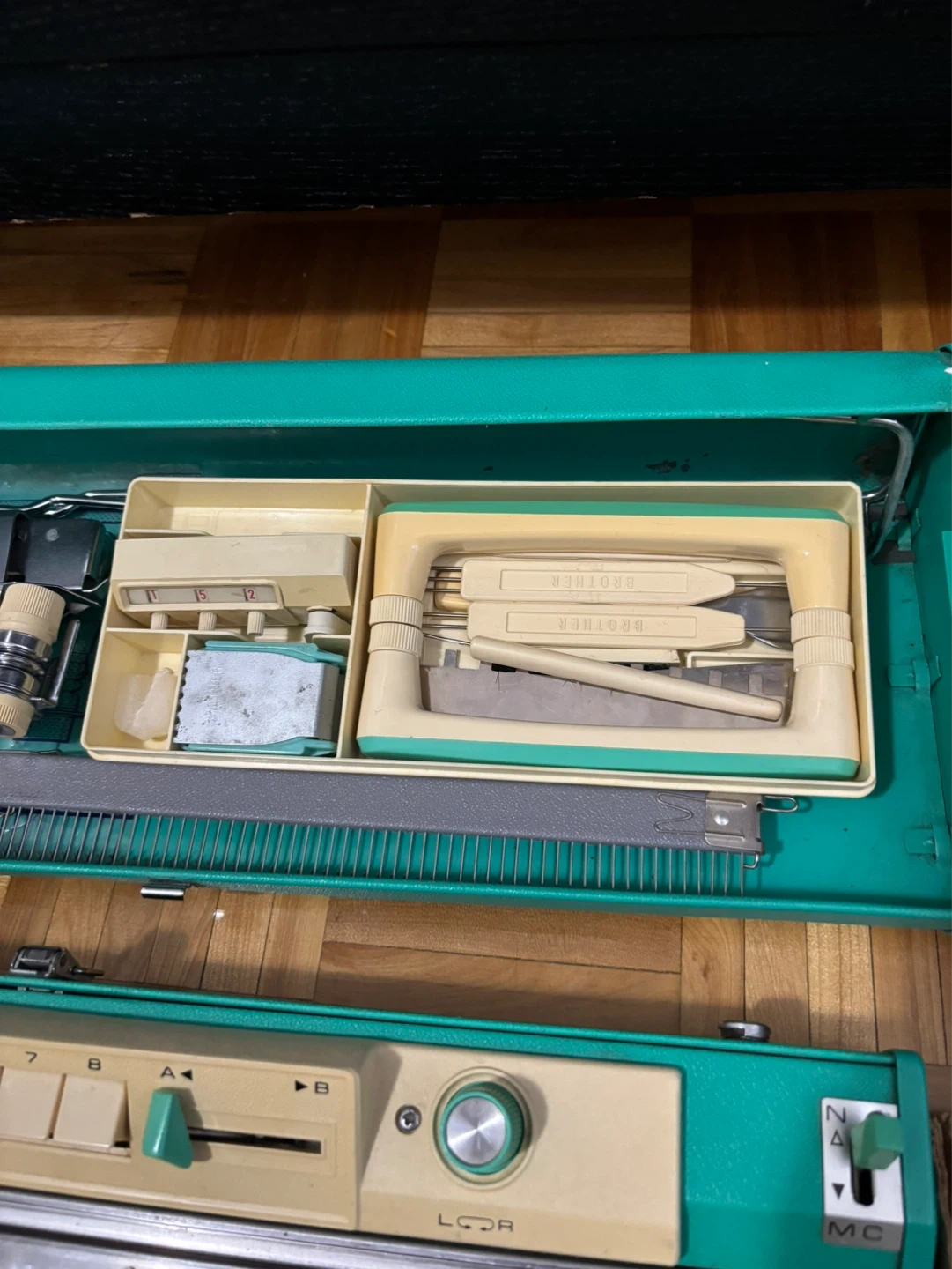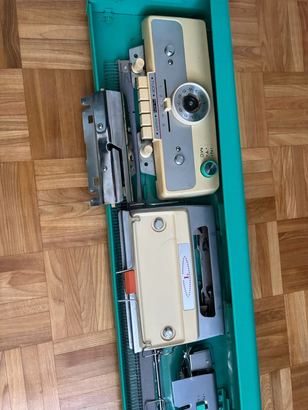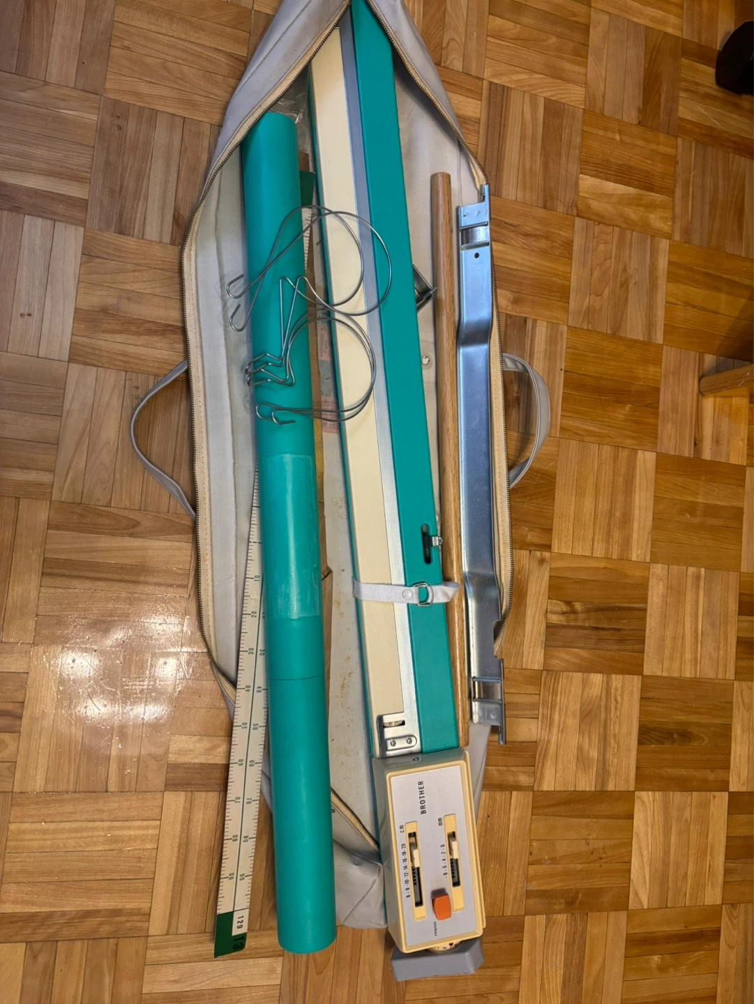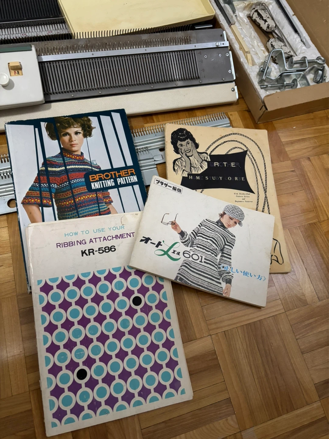 This listing includes a Brother knitting machine with various accessories, such as knitting pattern books and attachments like the KR-586 ribbing attachment. It also comes with a metal tin of clamps and a toolbox with additional metal components. The set includes multiple parts and manuals for different knitting functions.
