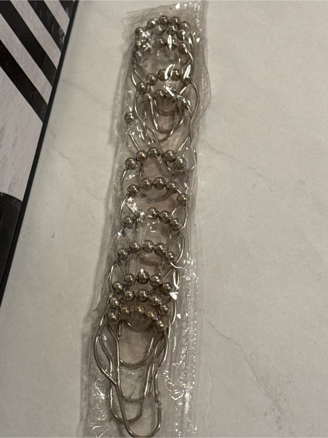 Set of shower curtain hooks with roller balls. These hooks are made of metal and feature a polished chrome finish. They're designed to glide smoothly along the shower rod. Twelve hooks are included in the package.