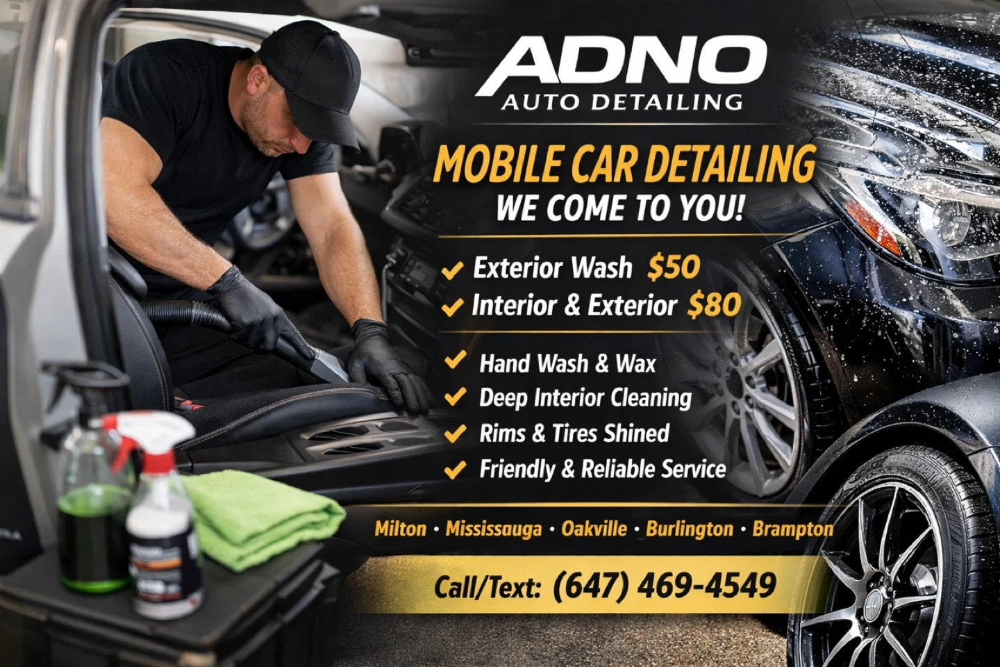 ADNO Auto Detailing offers mobile car detailing services. They provide exterior washes for $50 and interior & exterior packages for $80. Services include hand wash & wax, deep interior cleaning, and rims & tires shining. They serve Milton, Mississauga, Oakville, Burlington, and Brampton.
